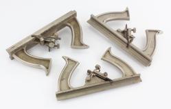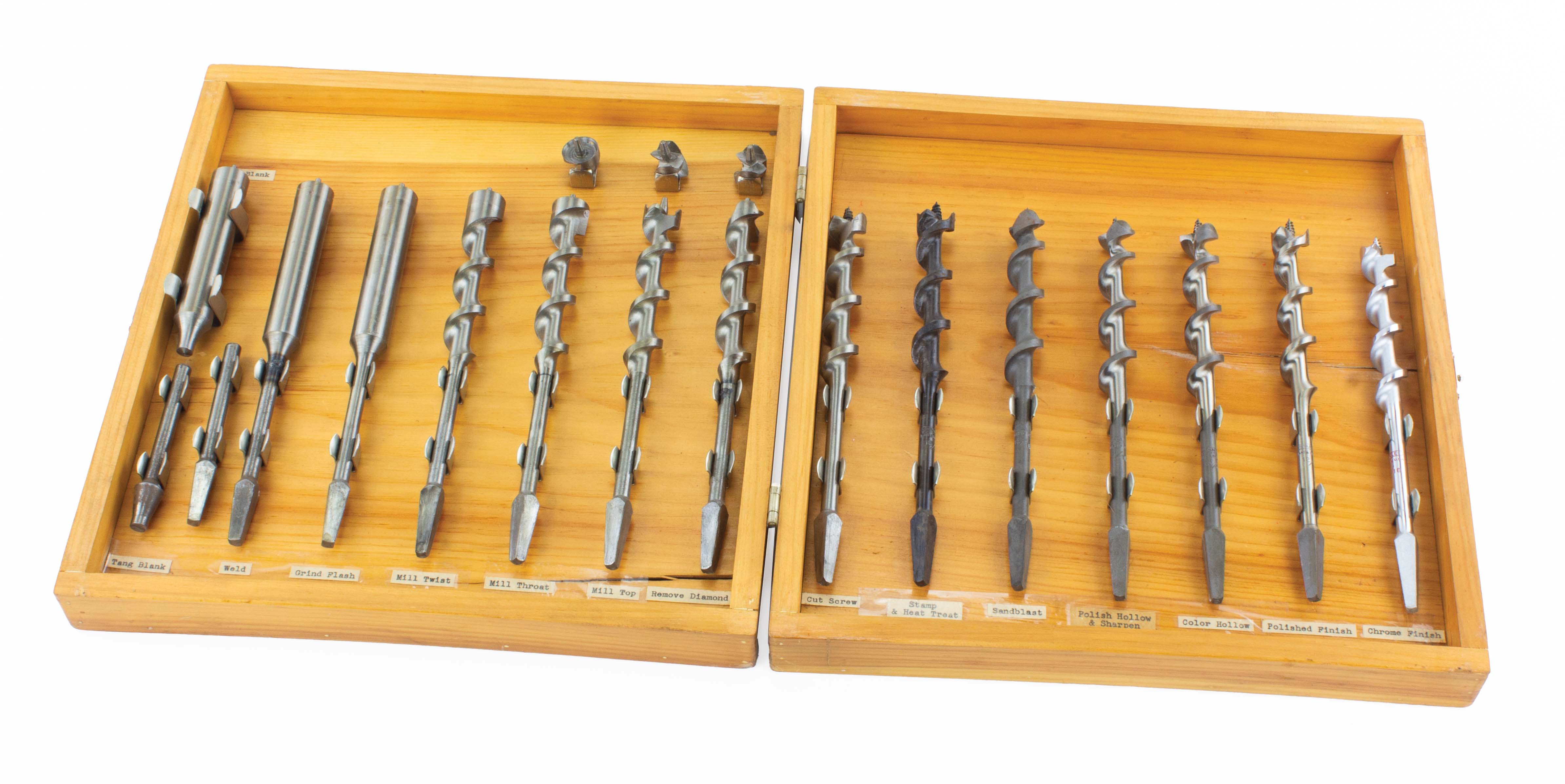 B68-90 AUGER BIT DISPLAY. Display illustrating the fourteen steps involved in producing a Stanley/Jennings auger bit, starting with the tang and body blanks and ending with the final chrome finish. The final product is an 11/16" bit, with the red Stanley notched rectangle mark. Examples of each state in the process are labeled and clipped into a hinged wooden box, 12-1/2" x 13" closed. The box has a couple of splits and scratches but each stage in the bit manufacturing process is immaculate, sharp and rust free. Three of the stages also have separate examples of the end. There are no other labels, and we're not sure what it was used for, but it was carefully assembled. From the collection of Jim and Christa Schoenky. Fine 175-350