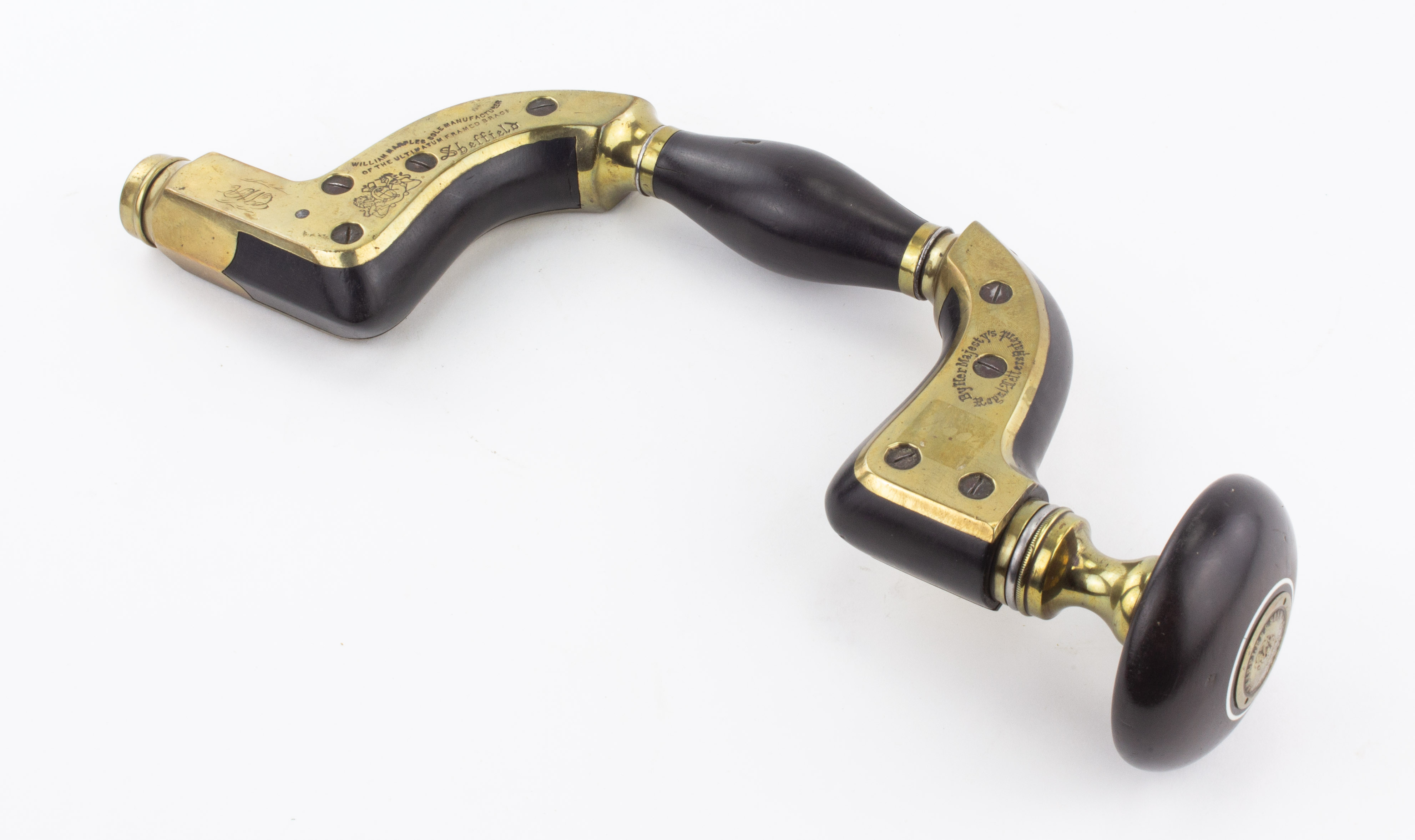 B68-98 FRAMED BRACE. Wm. Marples Ultimatum. Ebony body; complete ivory ring and Hibernia medallion in ebony head, sliding chuck, wood clean with a few small dings and lightly polished brass. User initials in fancy engraving near chuck. A nice example. From the collection of David Jeffers. Good+ 250-500