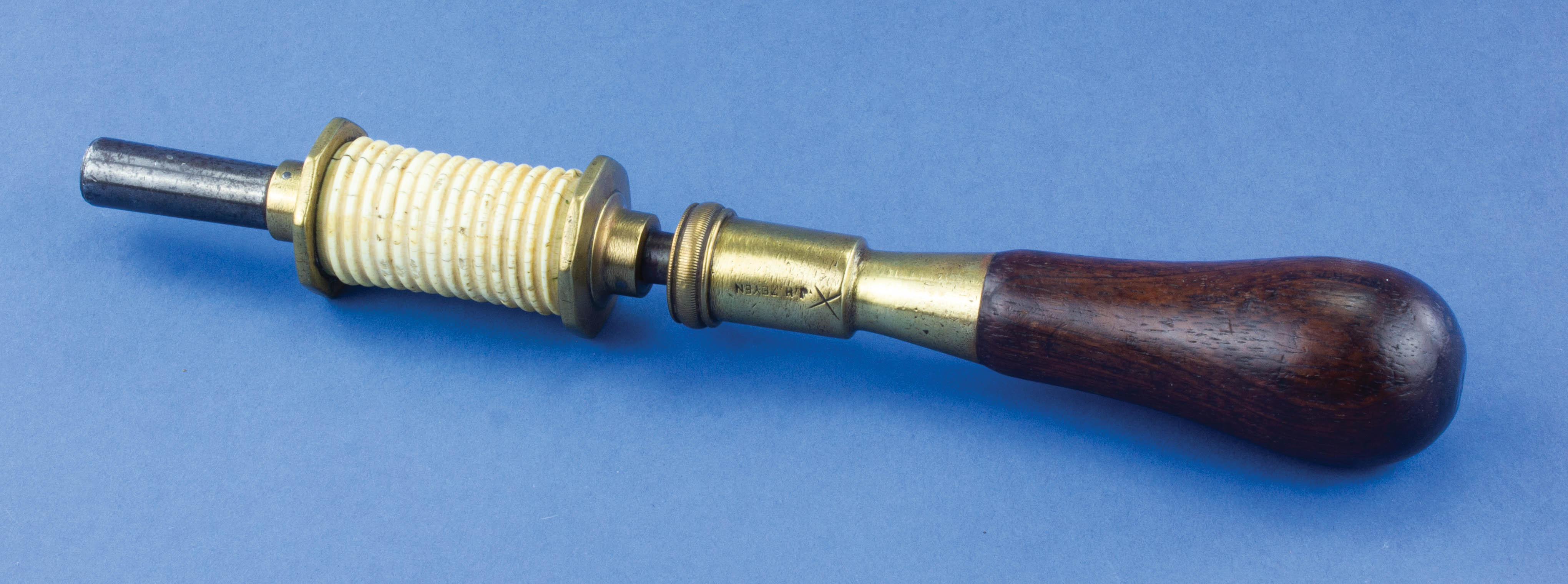 B68-100 BOW DRILL. 12" long with brass and rosewood handle, ivory spool with two cracks in it and some minor chips, friction chuck. Works smoothly. No visible mark but looks like those made by Erlandsen. A nice example. From the collection of David Jeffers. Good+ 125-250