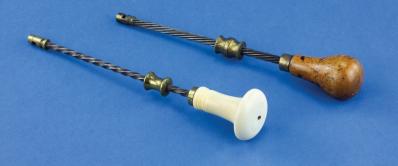 B68-107 LOT OF TWO JEWELER'S ARCHIMEDEAN DRILLS. Both 8" long, one with ivory head that has one crack, other has boxwood head with staining. Both have brass friction chucks and sliding brass grips. Both work smoothly. From the collection of Jim and Christa Schoenky. Good+ 100-200