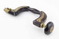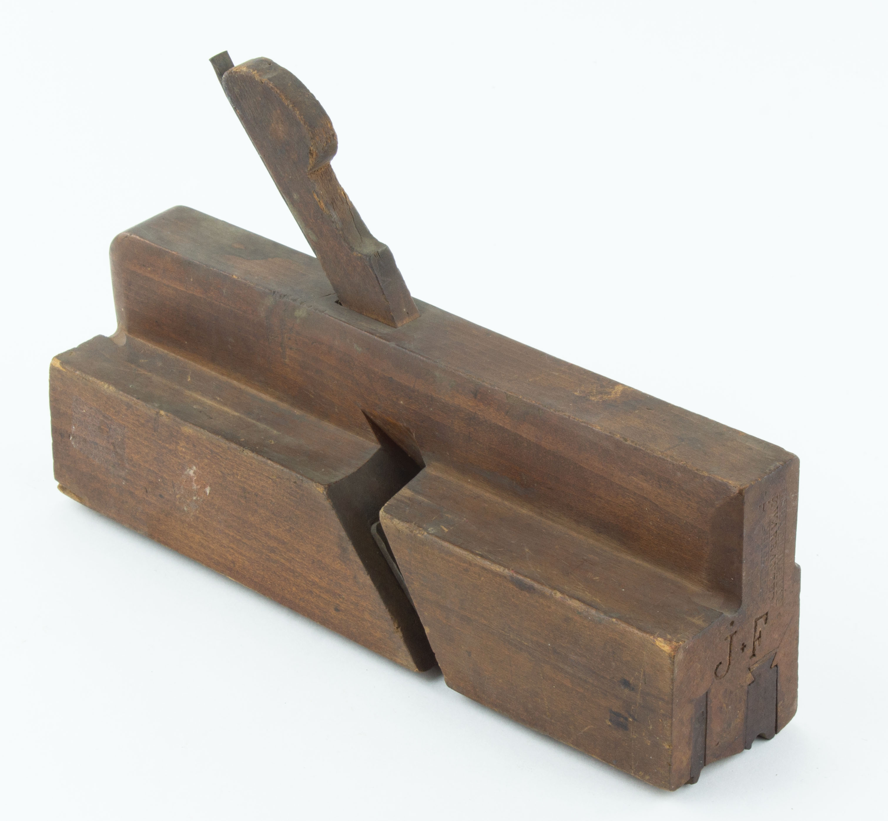 B68-115 MOLDING PLANE. Israel White. Cuts 1-1/2" quirk, ogee, and astragal, 9-1/2" sole. Double boxed with lignum. Wood has light overall wear with a few cracks and chips in lignum strips. H mark. From the collection of Jim and Becky Leamy. Good 100-200