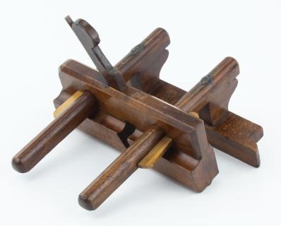 B68-120 EIGHTEENTH CENTURY ADJUSTABLE-FENCE FLUTING PLANE. George Mutter. Cuts a 1/4" flute, 7-1/2" sole. Wedge locked arms with original boxwood wedges. Large chip from fence but wood otherwise clean. Unusual. From the collection of Jim and Becky Leamy. Good+ 60-120