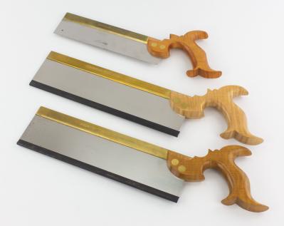 B68-124 LOT OF THREE BRASSBACK SAWS. One by Independence Tool with 9" blade. And two by Medallion Tool Works with 12" blades, ash handles and blade protectors; some very light spots of corrosion on one blade otherwise all in near new condition. From the collection of Jim and Becky Leamy. Good+ & better 100-200