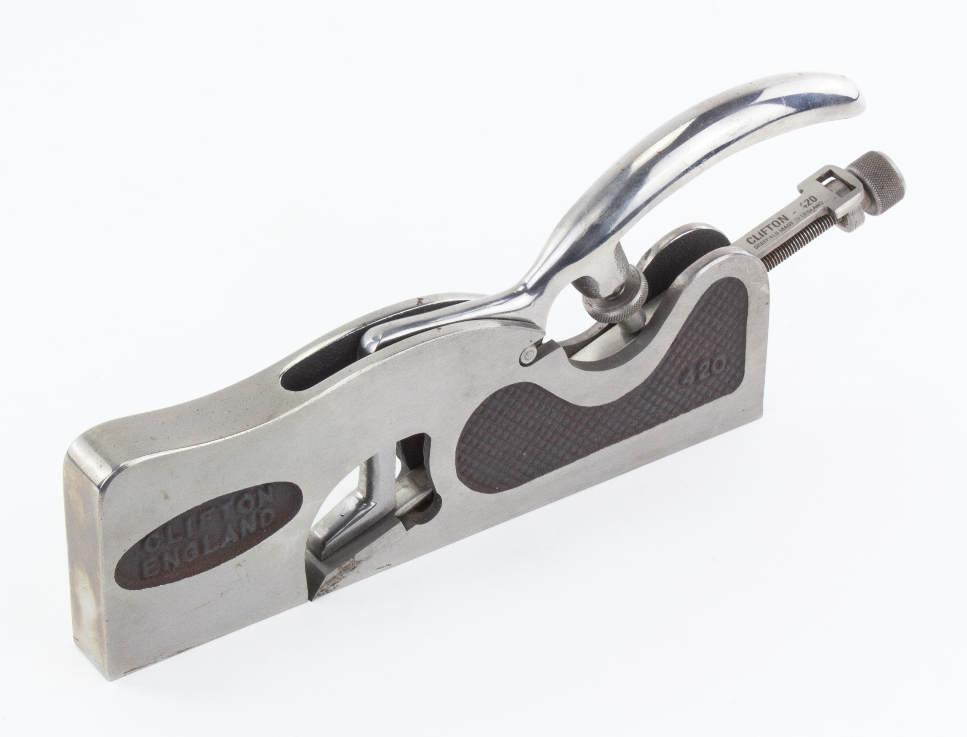 B68-127 MODERN MAKER. Clifton No. 420 Shoulder Plane. Clico Tooling of Sheffield, which manufactures the Clifton Planes, is the successor to Preston, and this is modeled after the Preston line of patented adjustable shoulder planes, 8" sole with 3/4" cutter. Mild wear. From the collection of Jim and Becky Leamy. Good+ 75-150