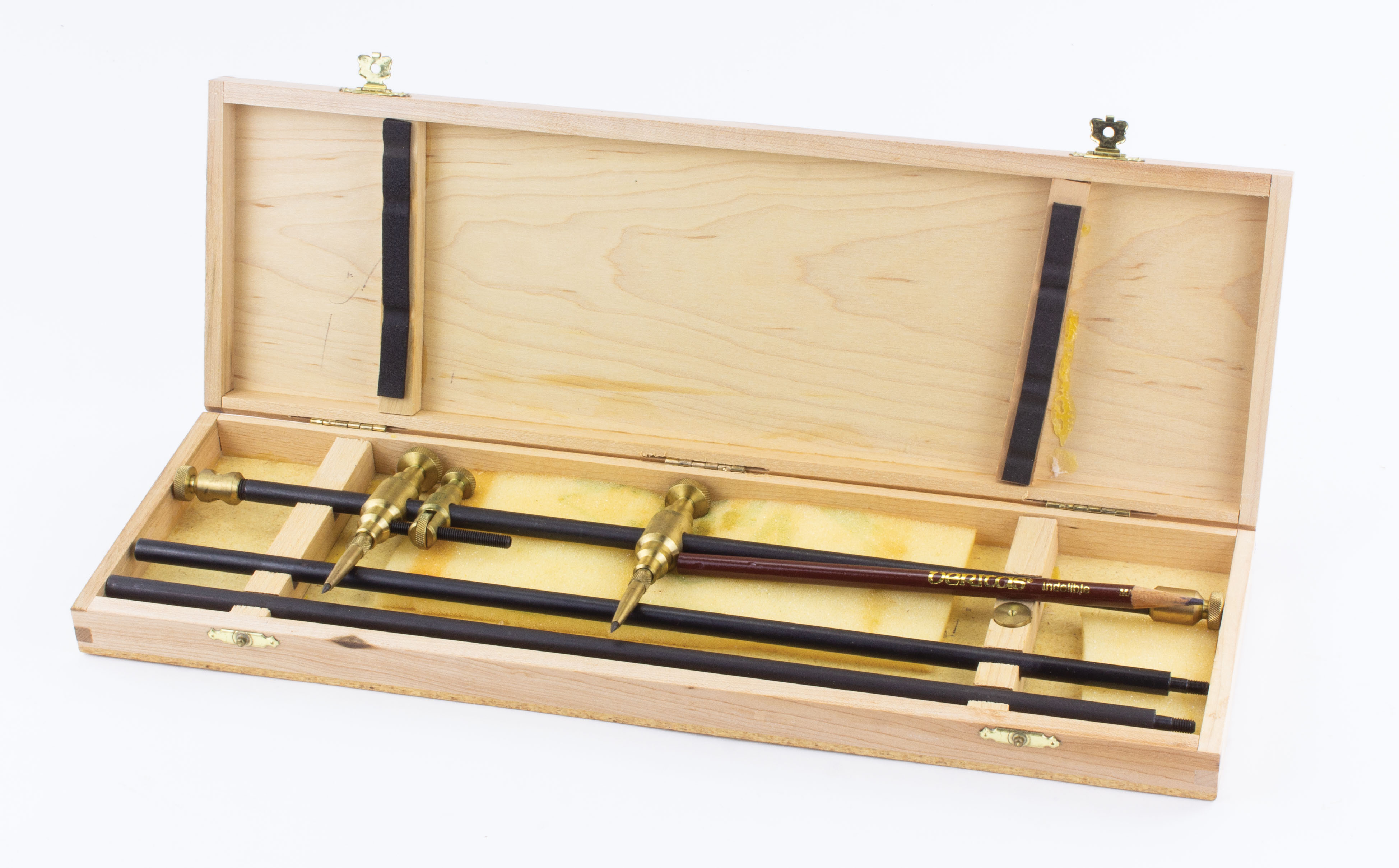 B68-134 MODERN MAKER. Veritas Beam Compass IOB. Includes two brass trammel points, one with microadjustment and pencil holder, mounted on a 14-1/2" steel rod with two 14" extensions, and brass pivot disc. All inside original wooden box with lightly stained instruction sheet. Fine 50-100