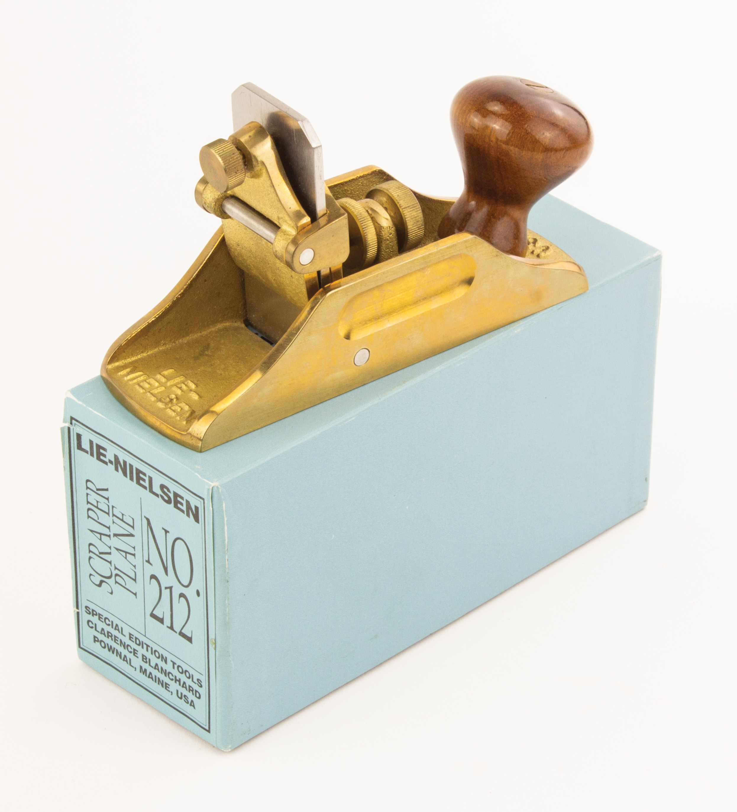 B68-136 MODERN MAKER. Lie-Nielsen No. 212 Scraper Plane IOB. One of the special edition models offered by the Fine Tool Journal in 1994 in partnership with L-N, number 185 of 350. 5-3/8" long, cast brass with cherry knob, appears mint with original packaging and certificate. Box intact with good label. From the collection of Harold Unruh. Fine 200-400