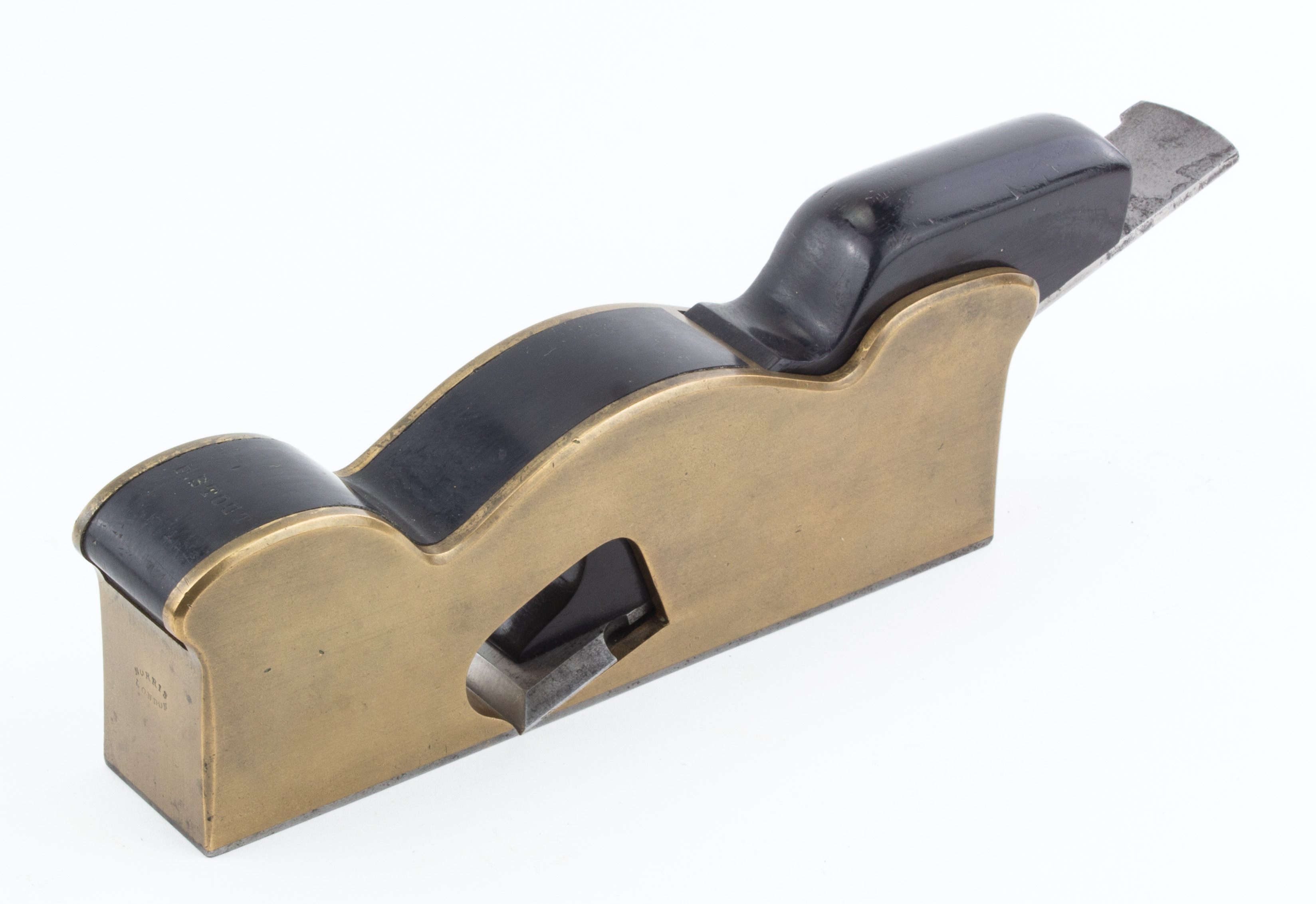 B68-141 GUNMETAL INFILL SHOULDER PLANE. Norris No. 20E. York pattern, 7-3/4" sole with 1-1/2" original Norris iron, ebony fill and wedge. Iron, body, and wedge all marked with assembly letter D. Wood infill a little loose but otherwise in near mint condition, "Norris London" marked on toe. Good+ 250-500