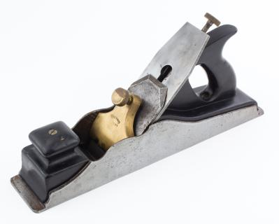 B68-144 INFILL PANEL PLANE. Norris No. A1. 14-1/2" dovetailed steel sole, 2-1/2" original marked iron, gunmetal lever cap marked "Norris London", unusual steel-lined throat. It has a brass screw through the bun that may have been inserted by a previous owner as an identifier. Bun also has small chip but wood otherwise has very light wear, metal very clean. Good+ 200-400