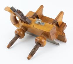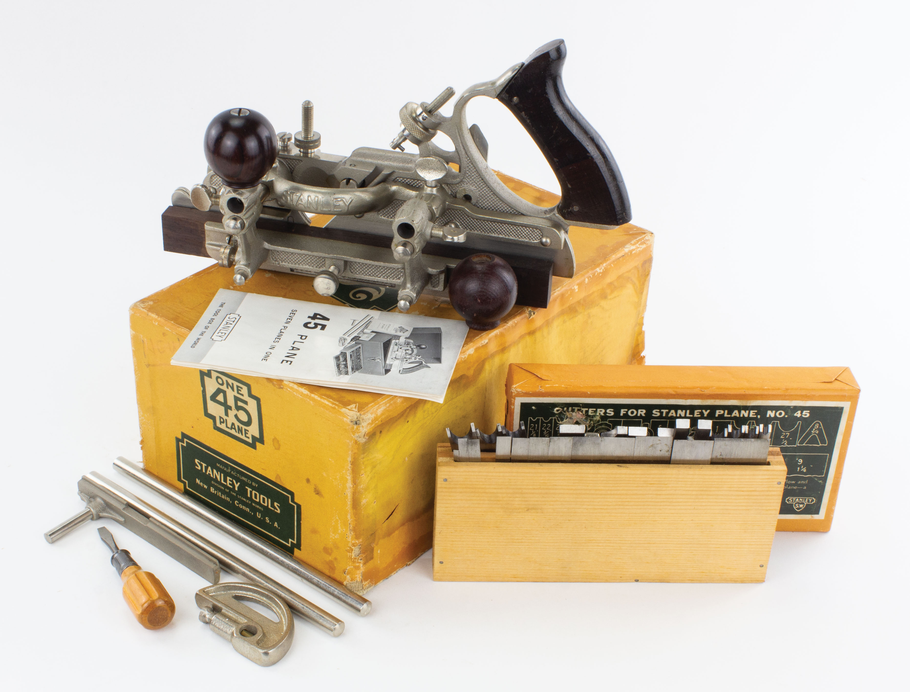 B68-159 COMBINATION PLANE. Stanley No. 45 IOB. Late type with notched rectangle on skate. Includes all parts, full set of cutters, and original instruction booklet. Nickel plating fully intact, wood fine. Box has some water damage but intact with complete label. Includes one extra knob. From the collection of Jim and Becky Leamy. Fine 150-300