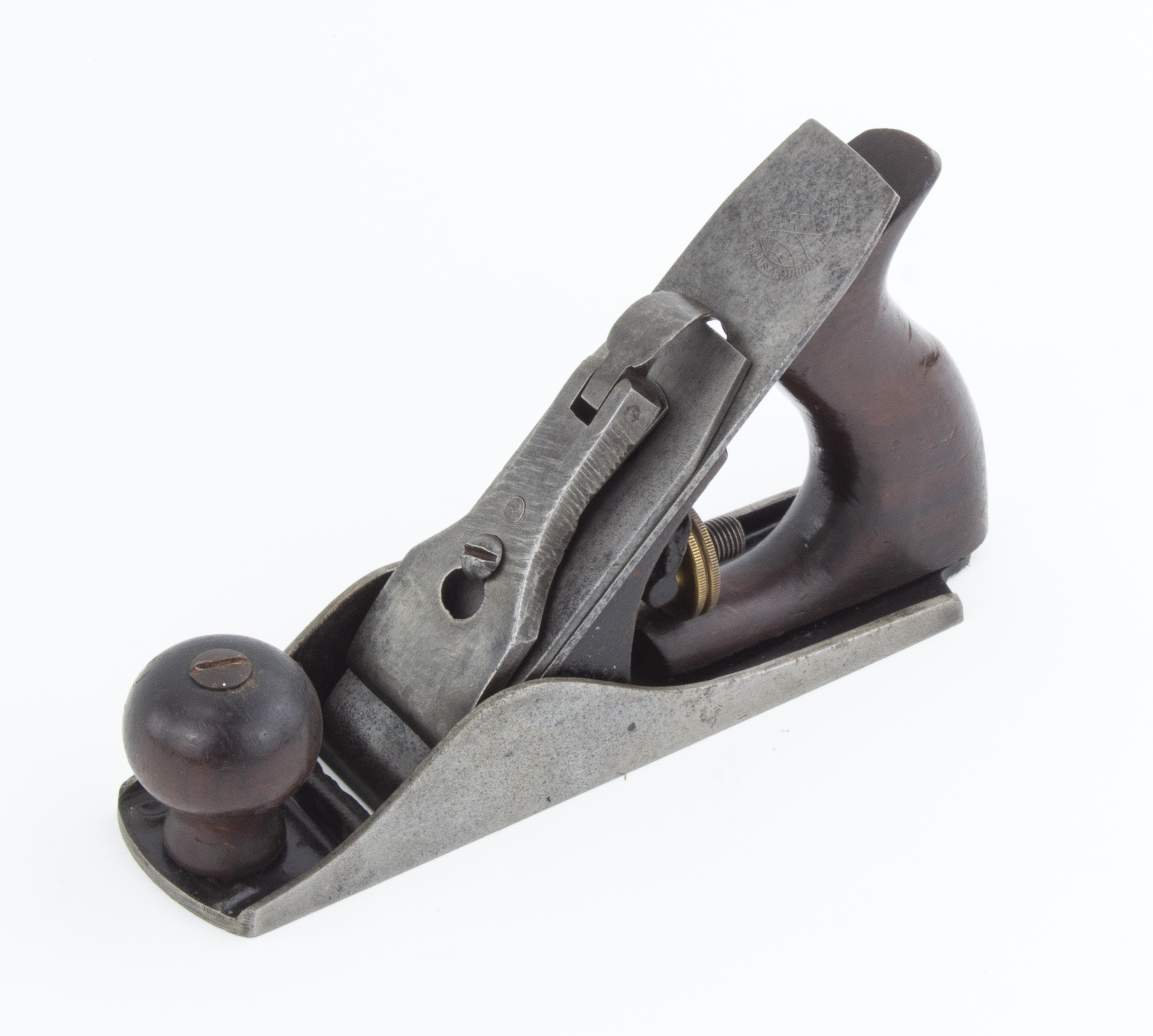 B68-171 SMOOTHING PLANE. Ohio Tool Co. No. O1C. The only No. 1 size plane that was made with a corrugated sole. Proper Globe cutter with unusual hexagonal cutout on backside, solid adjusting nut, tote and knob have mild wear, japanning 95%. Lever cap is a well-made replacement with filing marks on sides, tote may also be replacement. Still an uncommon example. From the collection of Harold Unruh. Good- 2000-4000