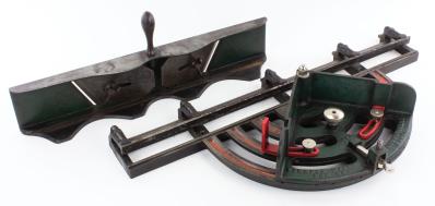 B68-174 MITER PLANER. Millers Falls. Patented in 1872 by David Rogers and manufactured first by Langdon Mitre Box and later by MF, this heavy duty brute makes short work of cutting miters and, unlike the typical shooting board, can cut right or left handed miters without slicing off the user's fingers. This is the largest size with 4" skew cutters, has 90% of its original red and green paint on body, traces of gold paint on plane, cutters unmarked. Complete and works smoothly. Good+ 1000-2000