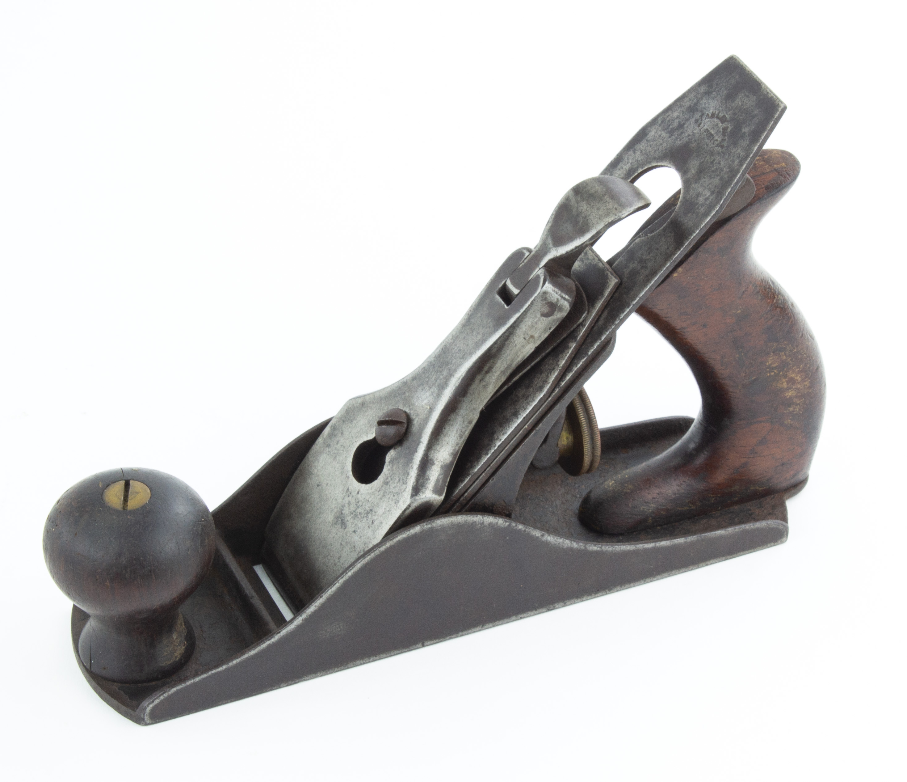 B68-175 NUMBER TWO SIZE PLANE. Stanley No. 2. Type 5 with the first type lateral, no numbers cast into bed, adjustment nut has Bailey patent date, J mark on cutter. Plain lever cap has traces of nickel plating, japanning 90%, crack in the knob but wood has light wear otherwise. Metal has overall oxidation but no pitting. From the collection of Ray Schmidt. Good 125-250
