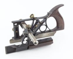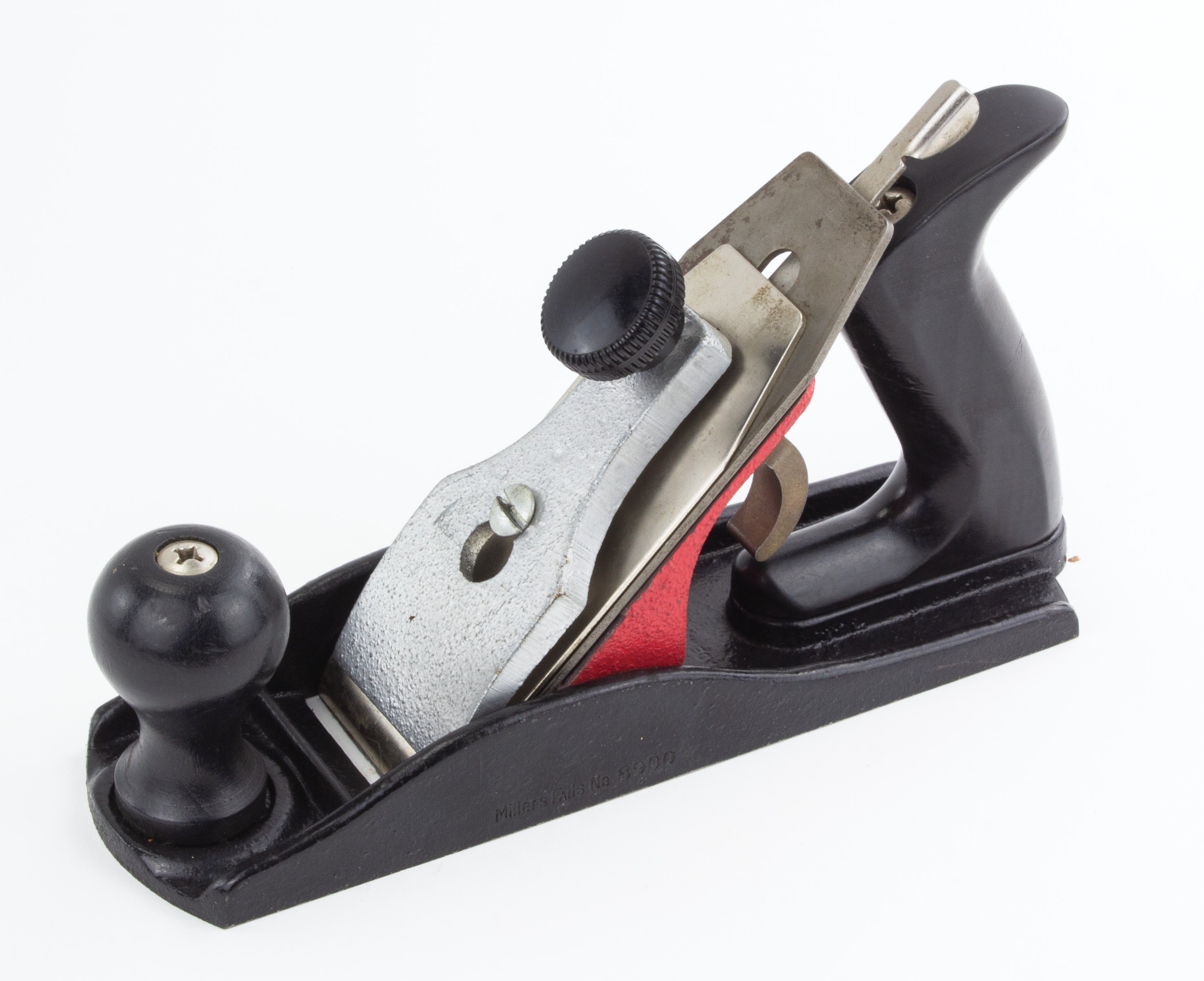 B68-176 TRIGGER ADJUSTMENT SMOOTHING PLANE. Millers Falls No. 8900. Made from 1974 to the mid-1990s. Has low cheeks, red japanning on frog sides, silver japanning on lever cap, and black japanning on bed are all intact. Plastic lever cap screw, ebonized tote and knob. The version of the No. 8900 pictured in the MF catalog was never actually produced, but one variation that was produced had a trigger-like adjustment mechanism behind the frog. This is a nice example of that version. Very unusual; for the Millers Falls collector who wants an example of every version. From the collection of Steve Dice. Fine 100-200