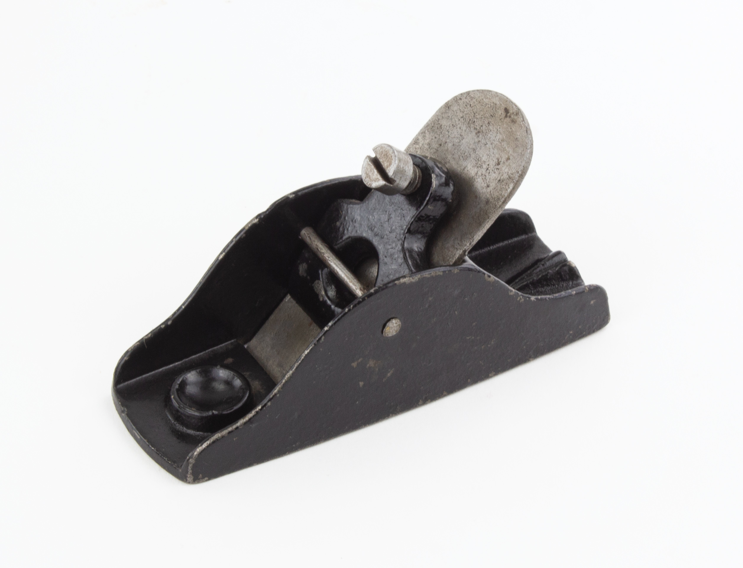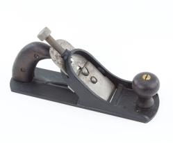 B68-178 MINIATURE BLOCK PLANE. 4" sole, 1-1/8" cutter marked "H.B & Son, Prolific, Sheffield," which stands for Henry Bernascone & Son. Resembles a Stanley No. 101 but larger, lever cap has open hole in center and flat-head locking screw, held with pin through cheeks. Cast thumb rest, japanning 95%. From the collection of Harold Unruh. Good+ 50-100