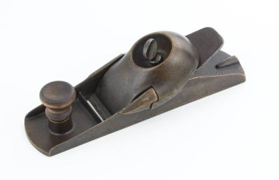 B68-179 REPRODUCTION BLOCK PLANE. Brass Copy of Bailey Tool Co. Model B with Cast Sole. All brass except for cutter, very well made reproduction of the highly prized version of the Model B block plane with Bailey Tool Comp. cast into sole. Appears old with oxidation; wooden knob looks original with mild wear. Unmarked cutter. From the collection of Harold Unruh. Good+ 150-300