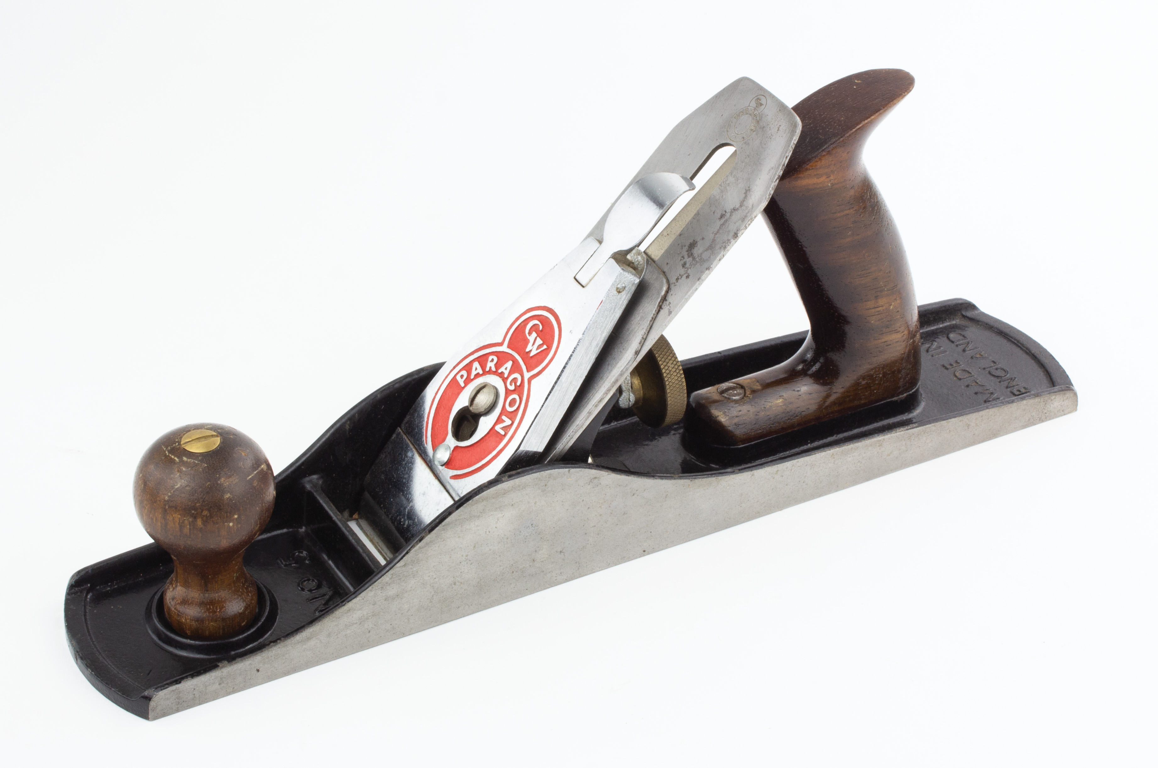 B68-182 MODERN MAKER. Paragon No. 5 Jack Plane. Made by Footprint Planes and distributed by Garrett Wade and Lee Valley. The lever cap has "GW" and "Paragon" with red background cast into it, also marked "Made in England." Original marked cutter. Light wear to tote and knob but metal is like new. Good+ 50-100