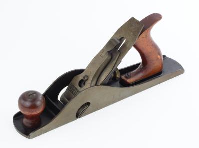 B68-188 CARRIAGEMAKER'S RABBET PLANE. Patterned after a Stanley No. 10 but unmarked body, Union lever cap with Stanley sweetheart cutter, japanning 95%, light wear to wood but no damage. Nickel plating worn off lever cap. Unsure who made it. From the collection of Harold Unruh. Good+ 125-250