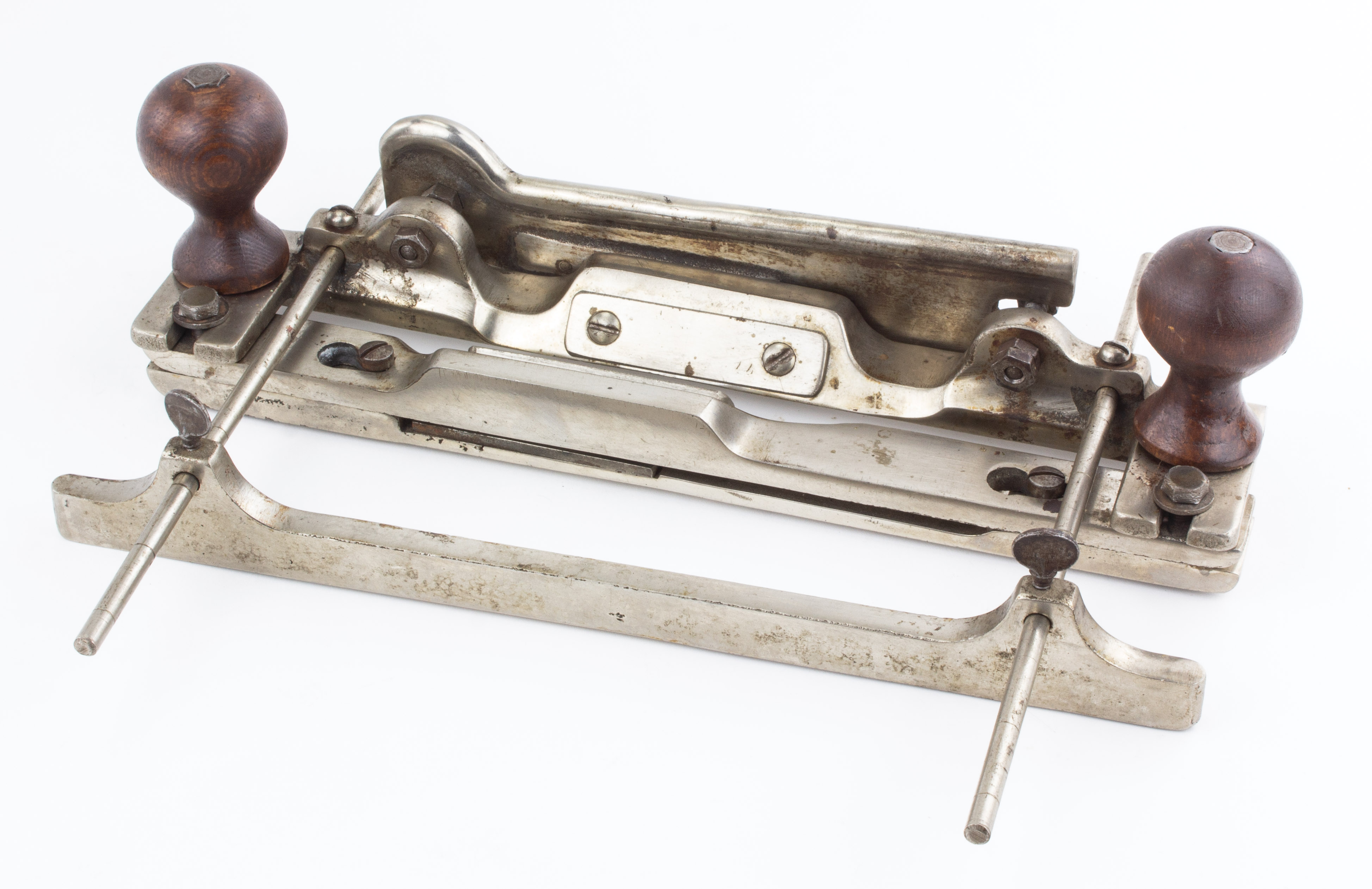 B68-190 FIBERBOARD PLANE. Looks manufactured but unmarked. Nickel plated, 12" sole with two razor blade type cutter holders, depth stop and fence. Well made and unusual. From the collection of Harold Unruh. Good 50-100