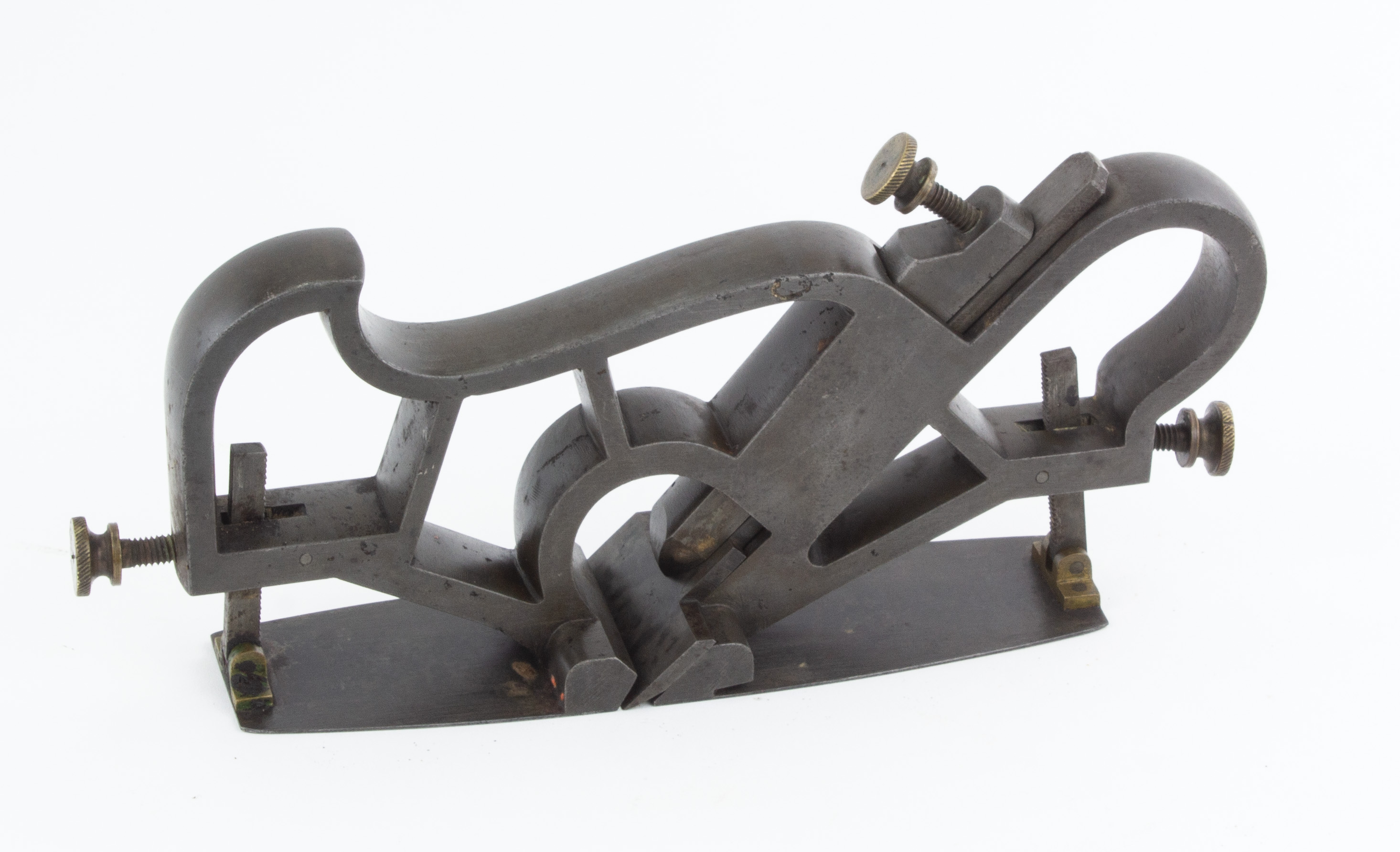 B68-197 FLEXIBLE SOLE PLANE. Cast iron cutout design in body, 6-1/2" sole, 1-3/4" unmarked cutter, three matching brass locking screws for sole and cutter. Appears user made but well done. From the collection of Harold Unruh. Good+ 100-200