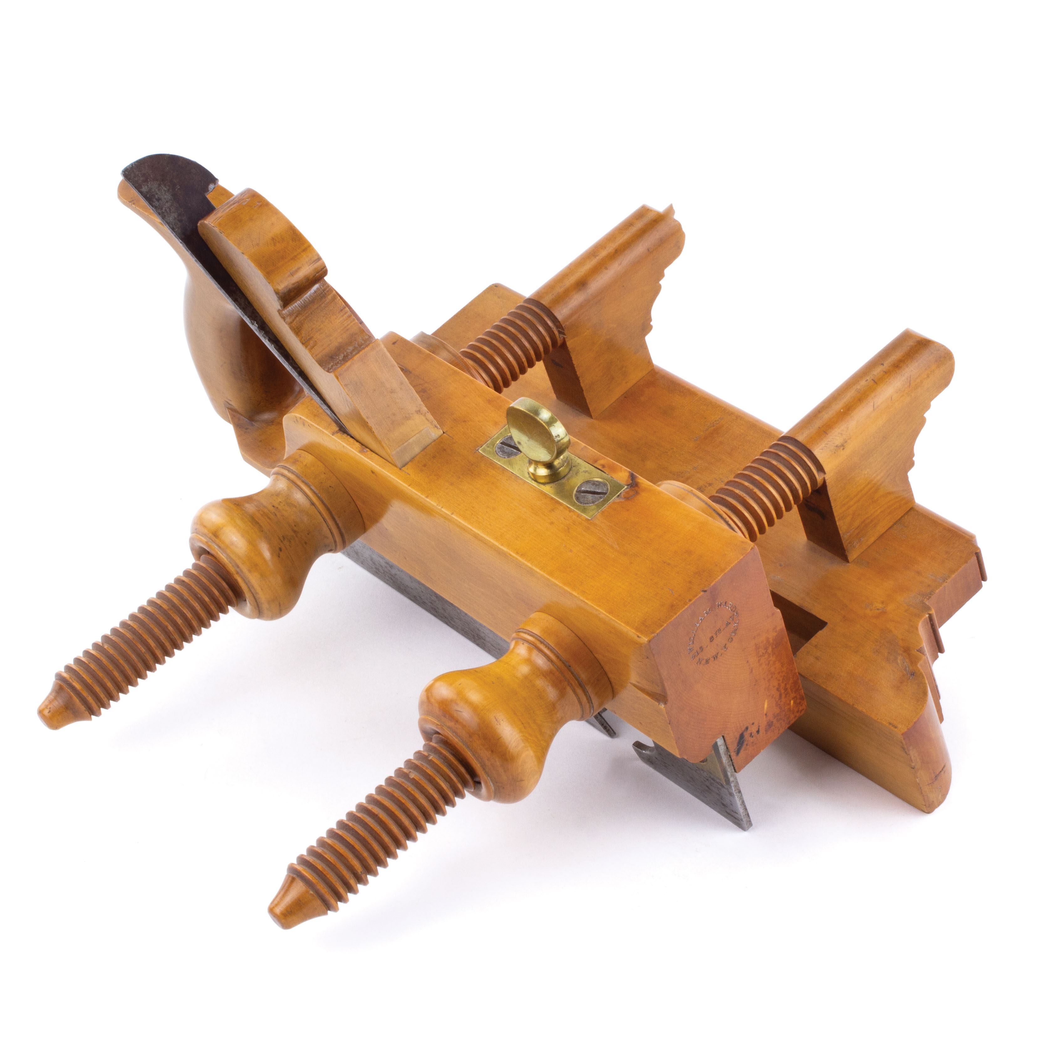 B68-202 BOXWOOD SCREW-ARM PLOW PLANE. William Ward. Solid boxwood throughout. One tight check in body and a few small stains, but wood otherwise in fine condition with only two tiny chips in threads. E mark on toe and Humphreysville cutter. From the collection of Jim and Becky Leamy. Fine 150-300