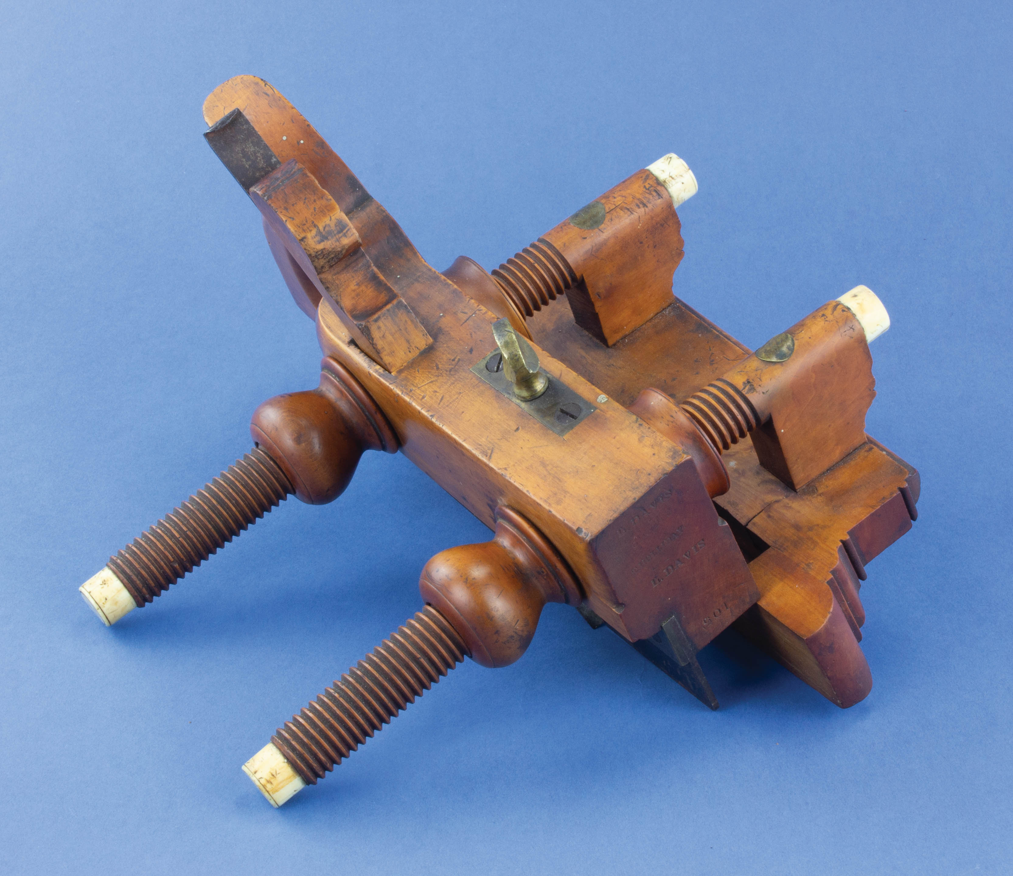 B68-205 IVORY TIPPED SCREW-ARM PLOW PLANE. T. Holliday. Ohio Tool Company No. 105 made for Cincinnati hardware dealer T. Holliday (2 stars). Solid boxwood throughout, four ivory tips with wear and cracking but intact. Body has overall scratches and age checks but no serious damage, oxidation on skate, cutter is spalled. Good 200-400