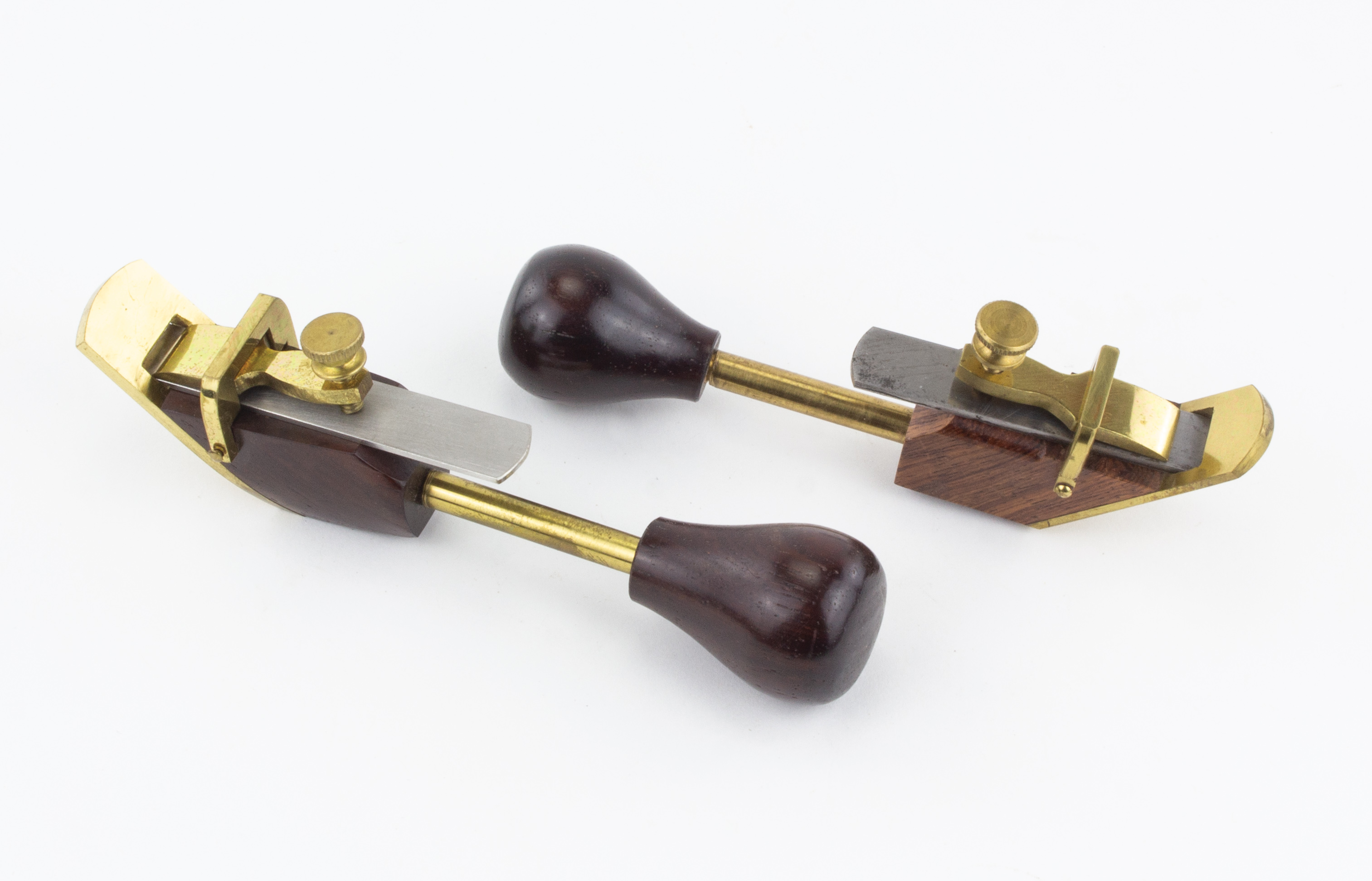 B68-209 MODERN MAKER. Lot of Two Handled Instrument Maker's Planes. Solid brass soles with rosewood bodies and handles. Both have 1-3/4" soles, one slightly convex and the other flat. Do not appear old but very well made. From the collection of Jim and Becky Leamy. Fine 200-400