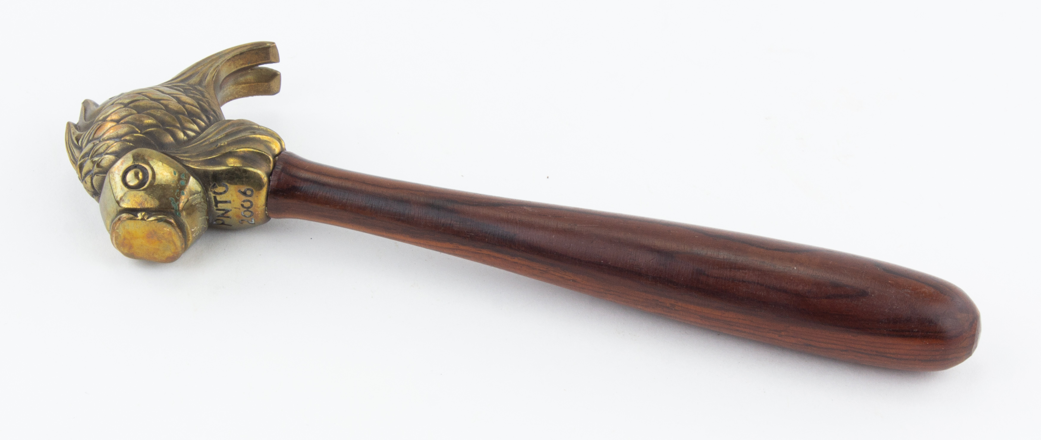 B68-210 2006 BEST IN THE WEST FAVOR. Fish Head Hammer. The miniature tool favors produced by the Pacific Northwest Tool Collectors to commemorate their biannual Best in the West meets are legendary and collectibles in their own right. The 2006 favor was a model of the very rare fish head hammer, with a 3" head and 6-1/2" rosewood handle. Mint condition with its original descriptive tag (tag not shown in photo). From the collection of Harold Unruh. Fine 100-200
