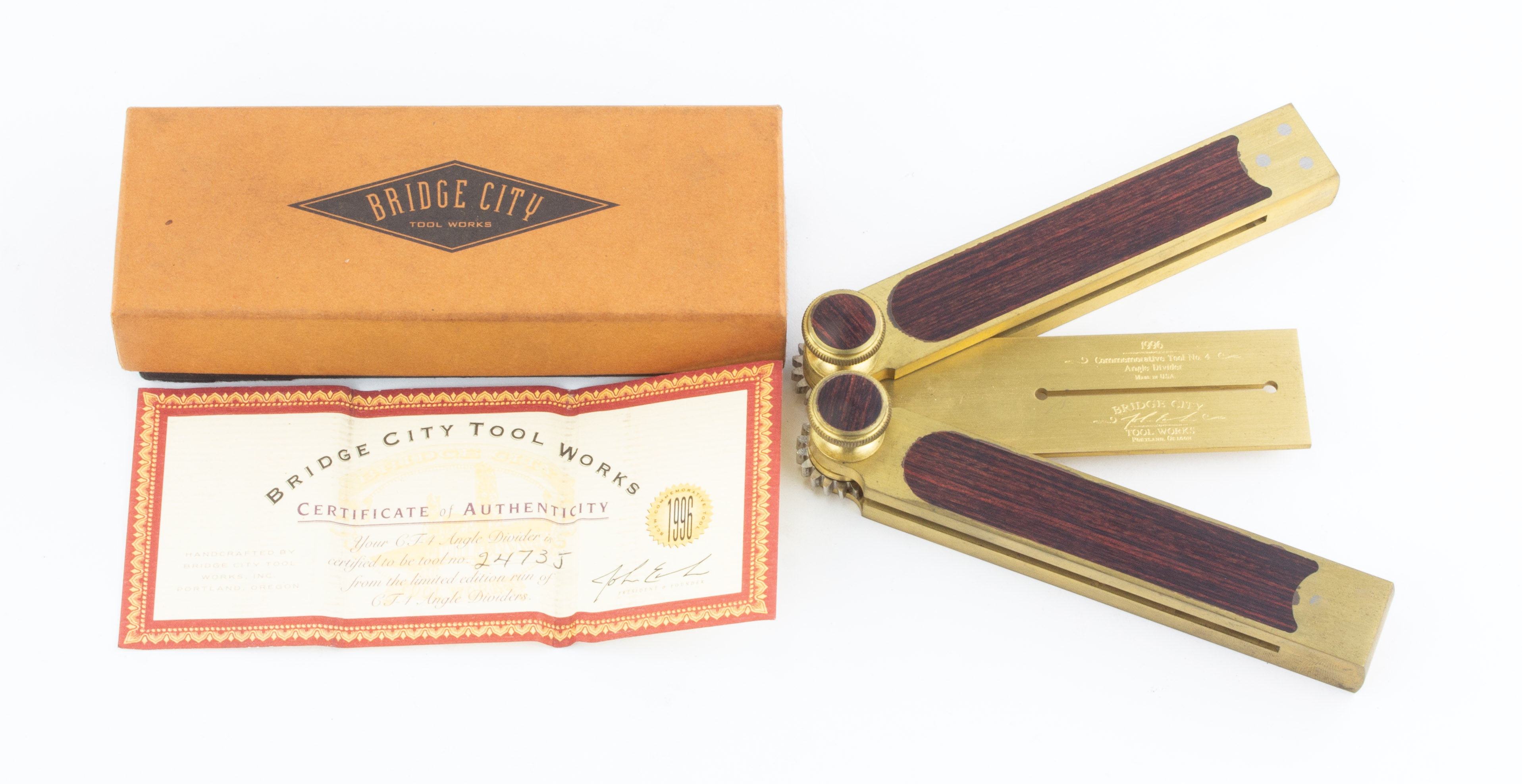 B68-212 MODERN MAKER. Bridge City CT-4 Angle Divider. 7" rule, brass and book-matched rosewood handles. This was one of the original 1996 Founder's Circle limited edition, marked with the number. They're not making them any more, but they were $174 new. Unused in original packaging. From the collection of Jim and Becky Leamy. Fine 100-200