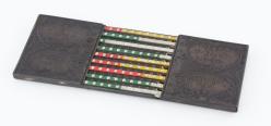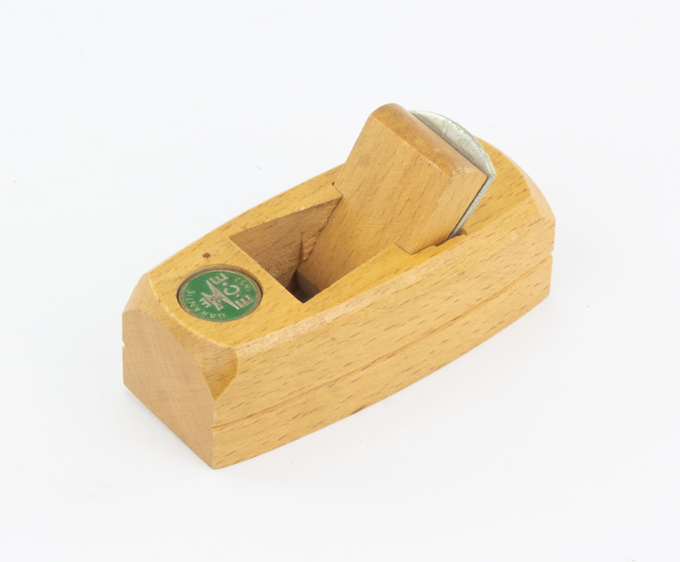 B68-217 MINIATURE COFFIN PLANE. Possible E.C.E. Salesman's Sample. Ash body, 3-1/2" sole with 1" original cutter. Sole is stamped with "Use Genuine E.C.E. Wood Planes, They're Tops." Mint condition. Fine 50-100