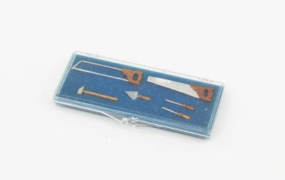 B68-221 LOT OF SIX MINIATURE CARPENTER'S TOOLS. Made by Cottage Industries and modern. Wood and thin metal. Two saws, two screwdrivers, a hammer, and a trowel, between 1" and 2" long. Inside original plastic case. Fine 40-80