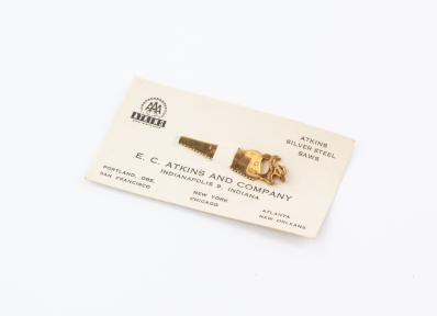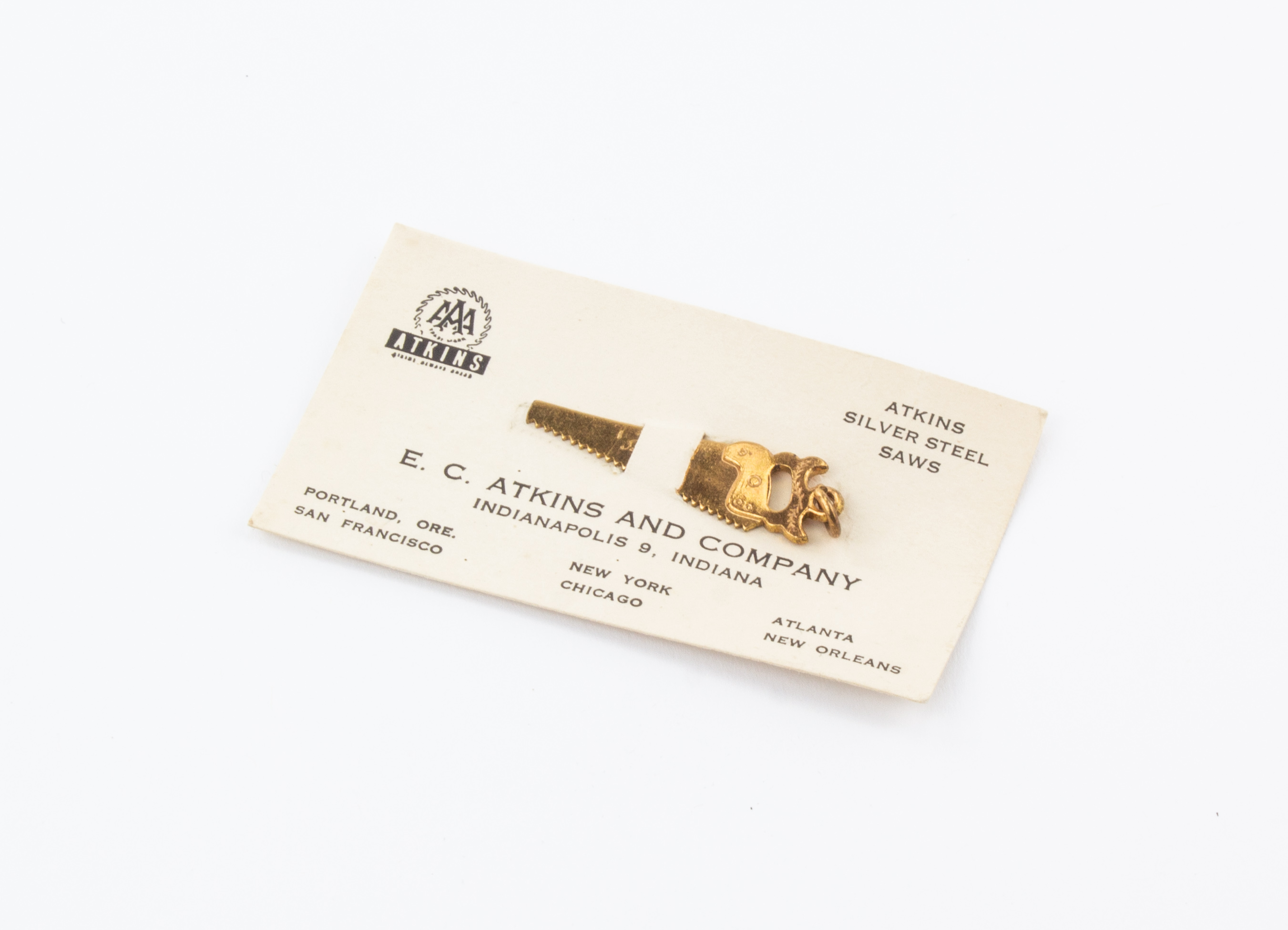 B68-222 ADVERTISING EPHEMERA. E.C. Atkins. Solid brass charm of a handsaw with wheatsheaf carving on handle, with ring at one end, 1-3/4" long. Mounted on an Atkins business card. Unusual. Fine 50-100