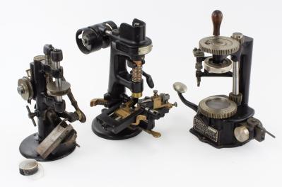 B68-224 LOT OF THREE LENS CUTTERS. Two made by Standard Optical Co., other is unmarked. Different types of cutters, each approximately 12" high, japanning 95%. Some light oxidation spots, but overall all are clean. All seem to function. Good+ 100-200