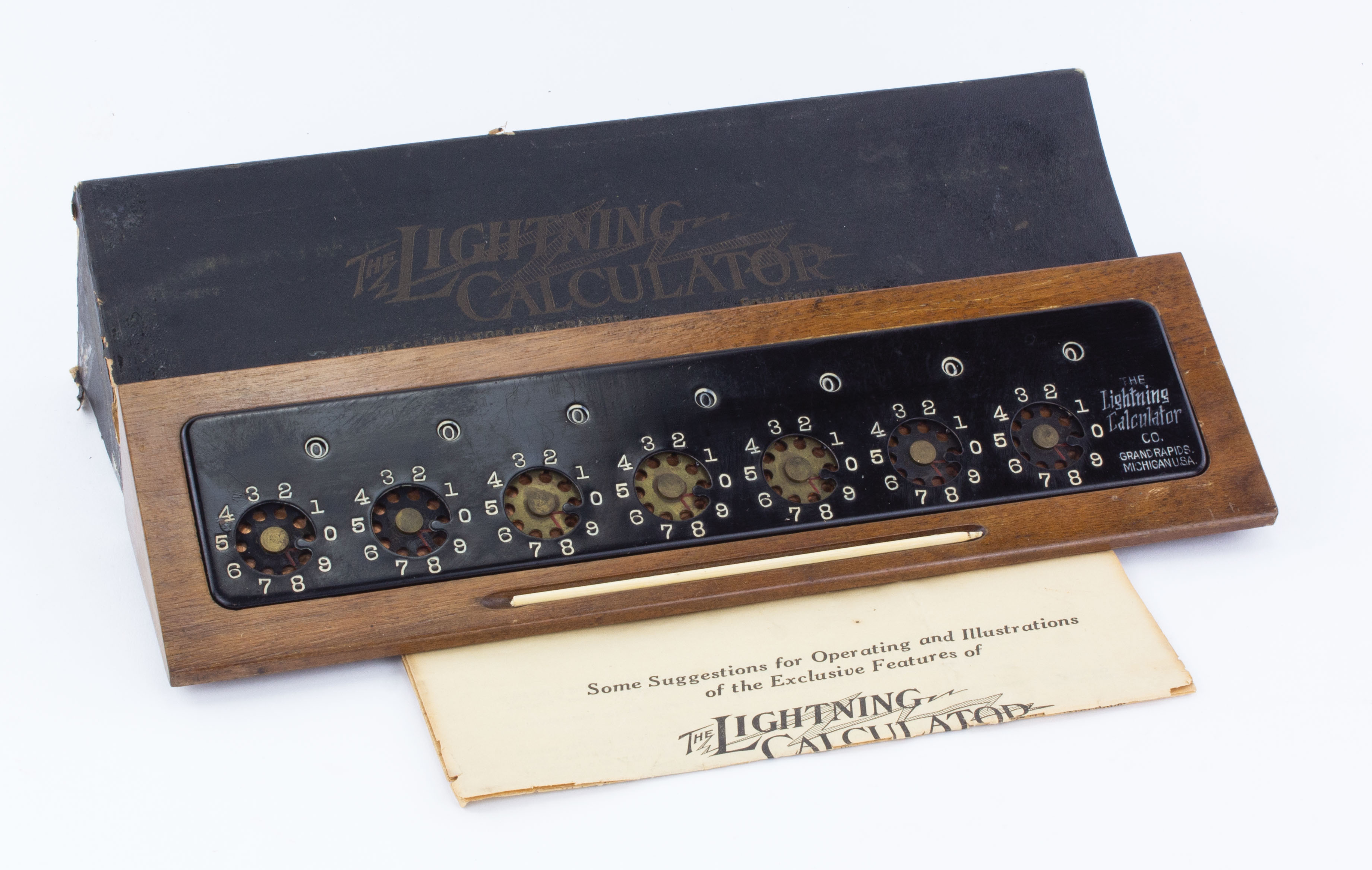 B68-225 ADDING MACHINE IOB. The Lightning. Made by the Lightning Calculator Co. of Grand Rapids, MI. Mounted on a 13" long wooden triangular base with bakelite stylus included, also includes original instructions which are worn with torn seams but complete. Original box missing one end. From the collection of Jim and Becky Leamy. Good+ 50-100