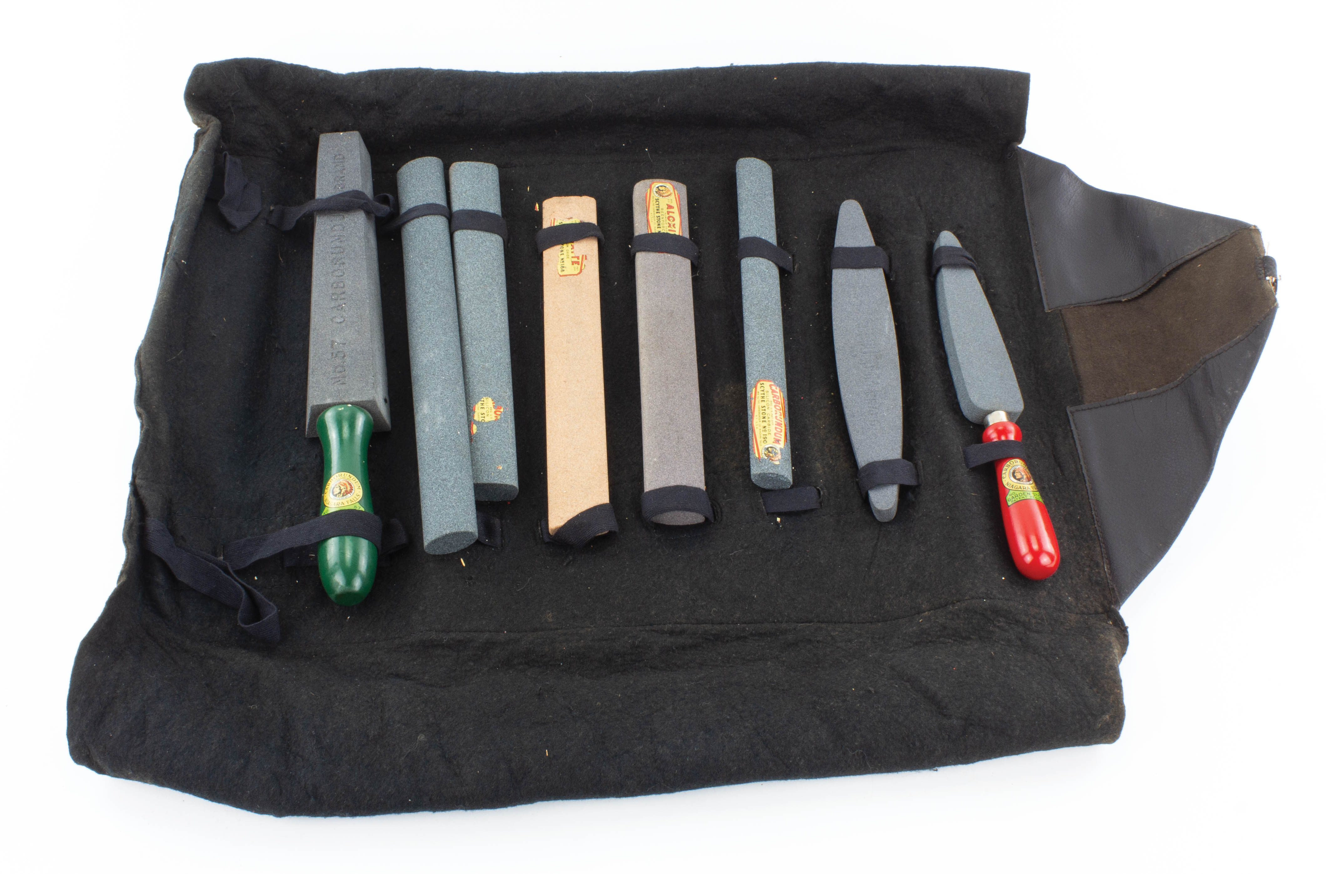 B68-226 SALESMAN'S SAMPLE KIT. Carborundum Sharpening Stones. Eight total with different lengths and composition, two with handles, most with original decals. Inside a leather and felt roll, all look unused but some decals worn. Uncommon. Good+ 100-200