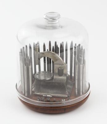 B68-227 WATCHMAKER'S STAKING SET. Unmarked but resembles those made by Kendall & Davis. 6" diameter wooden base with 7" tall glass dome, includes 44 stakes and 17 stumps with staking tool. Also includes article describing history and use. Good+ 100-200