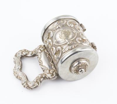 B68-229 DECORATIVE RAZOR SHARPENER WITH LEATHER STROP. 2" wide leather strop winds into decorative nickel plated drum with "B.C." monogram and decorative handle. English patent registration number. Clean with light use. Good+ 50-100