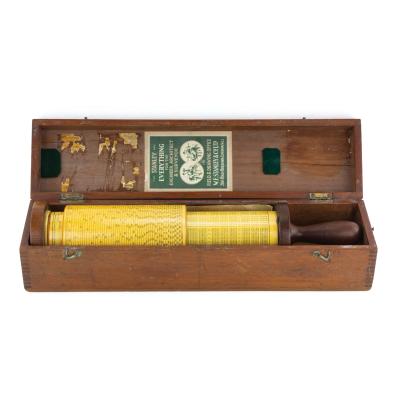 B68-231 CIRCULAR SLIDE RULE. W.F. Stanley & Co. No. 540. Based on Fuller's Patent and marked "Fuller's Spiral Slide Rule." 17" long, very clean. Original box includes original instruction sheet, one label in lid intact. Missing the end bracket designed to allow it to be mounted on the box. Good+ 150-300
