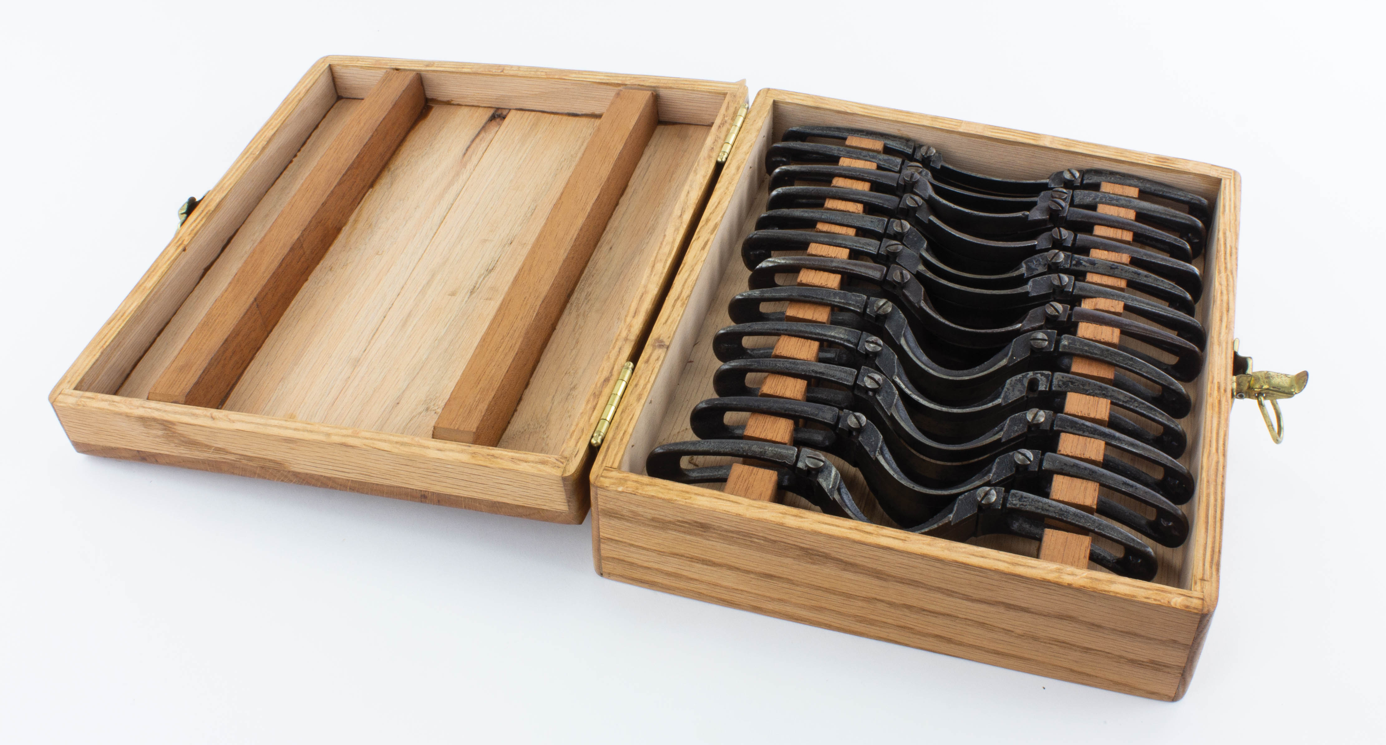 B68-234 SET OF HEEL SHAVES. Snell & Atherton. Twelve shaves in different curvatures, all marked and clearly a matched set. Japanning varied but mostly complete. One is missing a locking screw. Inside user made 10" x 11" oak box. From the collection of David Jeffers. Good+ 200-400