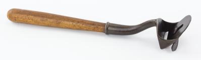 B68-241 PATENTED DRAW SHAVE. William Dutton. Patented February 9, 1869, by Wm. Dutton of Boston; not known to have been produced and not listed in Lamond. Rare example with 1-3/4" marked blade, original 7" wooden handle, overall light surface oxidation. From the collection of David Jeffers. Good 200-400