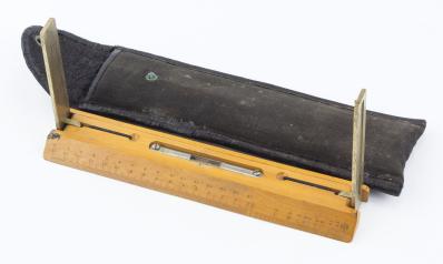 B68-244 ALIDADE NIVELATRICE. L. Thomas. French maker (nivelatrice is French for level), 9" long ruled wooden base with folding sight and original level vial intact, original canvas case. Complete label with instructions in French on reverse side of body. Good+ 100-200