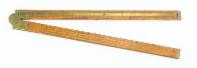 B68-258 CARPENTER'S SLIDE RULE. Stanley No. 27. Two-fold, two foot with brass slide, marked with Gunter scales. Boxwood has wear and one tight crack but still legible, has its pins. From the collection of David Jeffers. Good 75-150