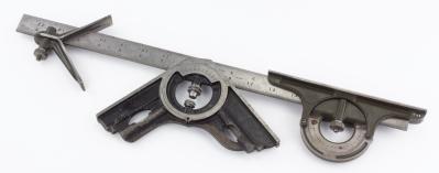 B68-259 PATENTED COMBINATION RULE. L.S. Starrett. Has combined square and bevel protractor patented by L.S. Starrett himself along with center finder and inclinometer, mounted on 18" steel rule. Japanning 80%, metal has some light surface oxidation but no pitting, vials wet. Center finder and protractor are married from another set. Good+ 100-200