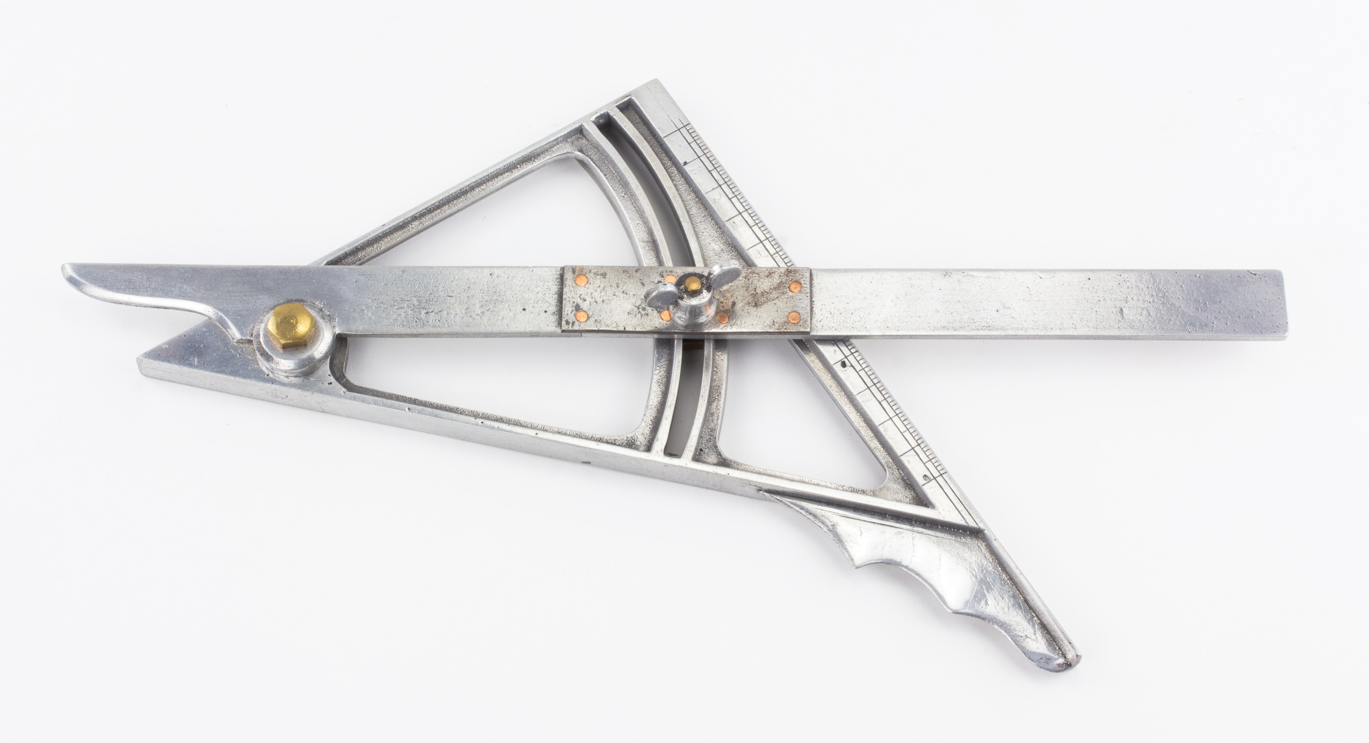 B68-262 ALUMINUM COMBINATION SQUARE AND BEVEL. Unmarked aluminum body, 8" x 9-3/4" with a 16" rotating arm. Arm has been repaired with steel plate beneath the locking screw but the arm cracked again around the rivets. Well made and unusual, never seen one before. Good- 50-100