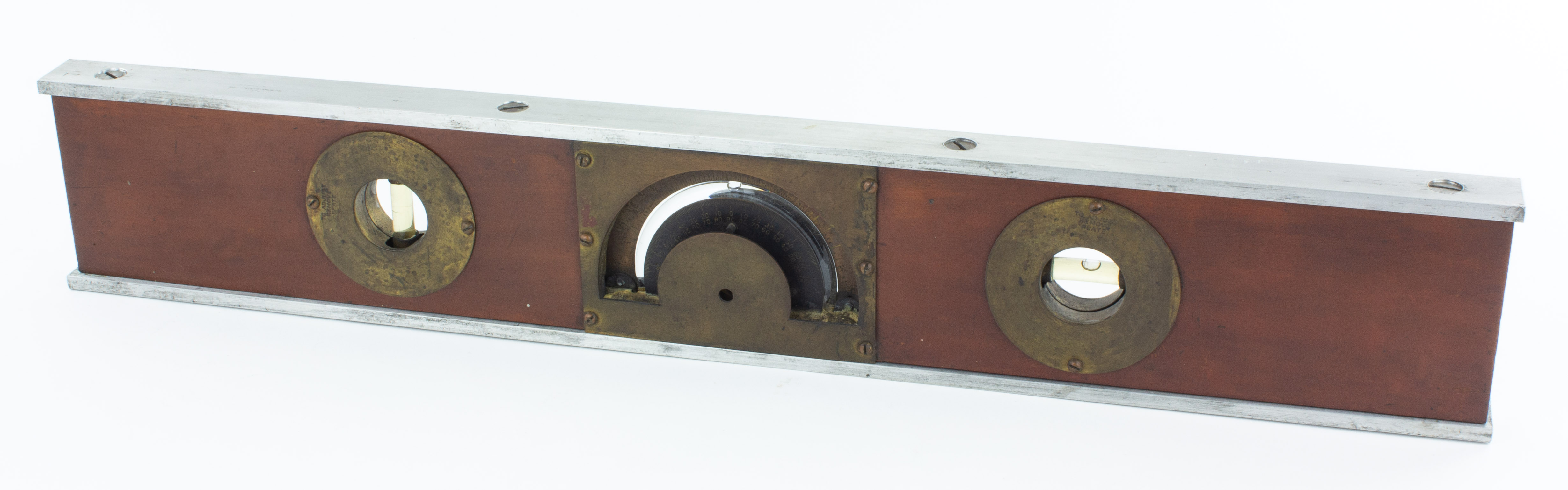 B68-267 PATENTED INCLINOMETER. Bradford Union. These levels with their distinctive semi-circular central vial were patented in 1904 by John Happle, and most of them were sold by the Bradford Union company of Bradford, PA. This is a typical example, 24" with cherry stock and aluminum rails. Light oxidation on brass, wood and metal otherwise very clean. All vials intact. Good + 300-600