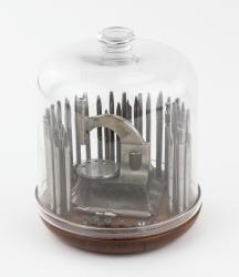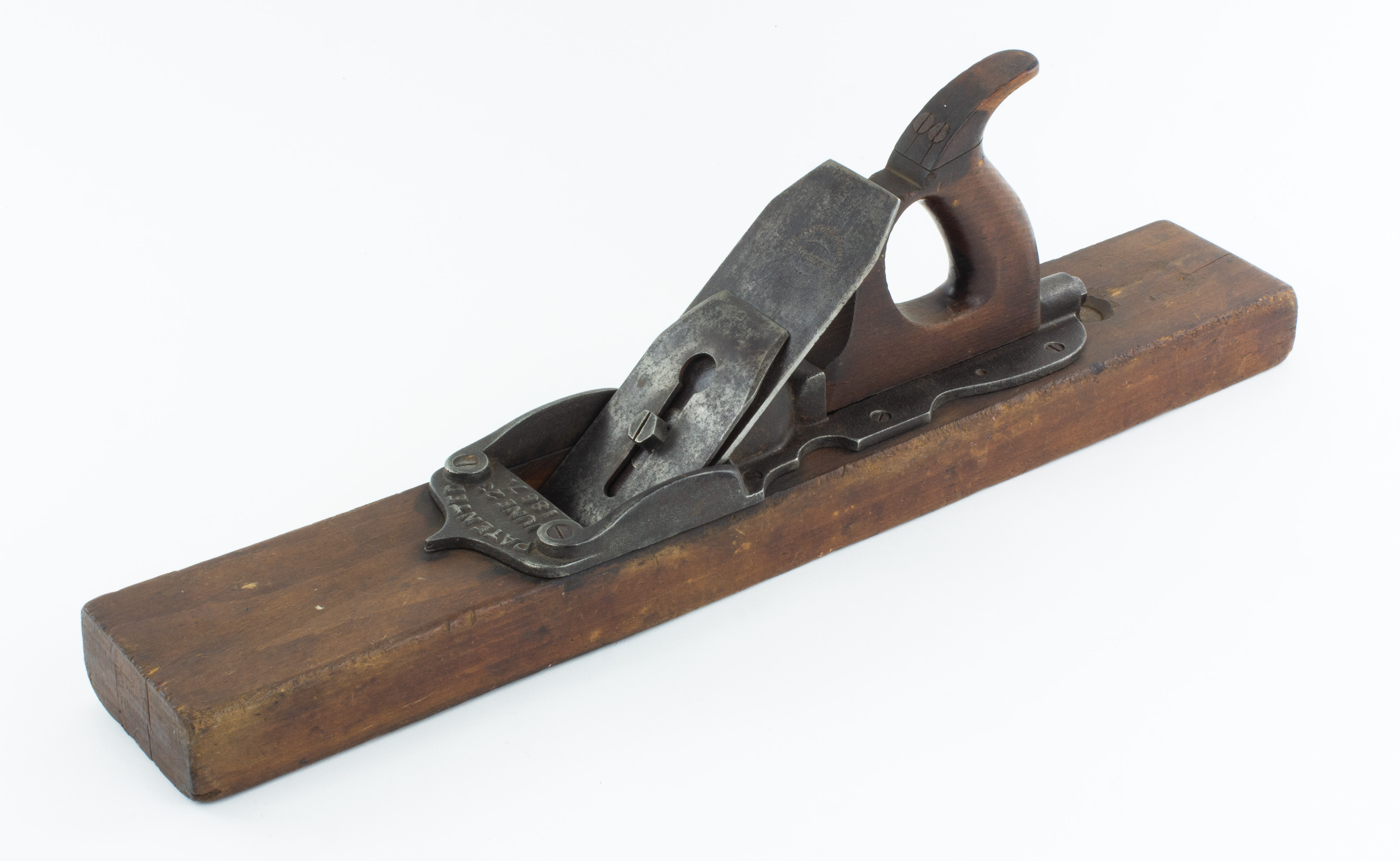 B68-280 JOINTER PLANE. Worrall Patent. 22" sole, uncommon variation on Thomas Worrall's 1857 patent that used a bolt through the rear of the plane to secure the cutter. Instead of having a full cast iron plate, it has a partial iron top with a socket for the tote. Similar to the fore plane in Figure 27a on page 29 of PTAMPIA I, with a 22" sole and no knob. Lowell Plane & Tool Co. B mark on toe. 2-1/2" marked Multiform cutter. Repaired tote, checks in throat, toe and heel. From the collection of Cliff Sapienza. Good 125-250