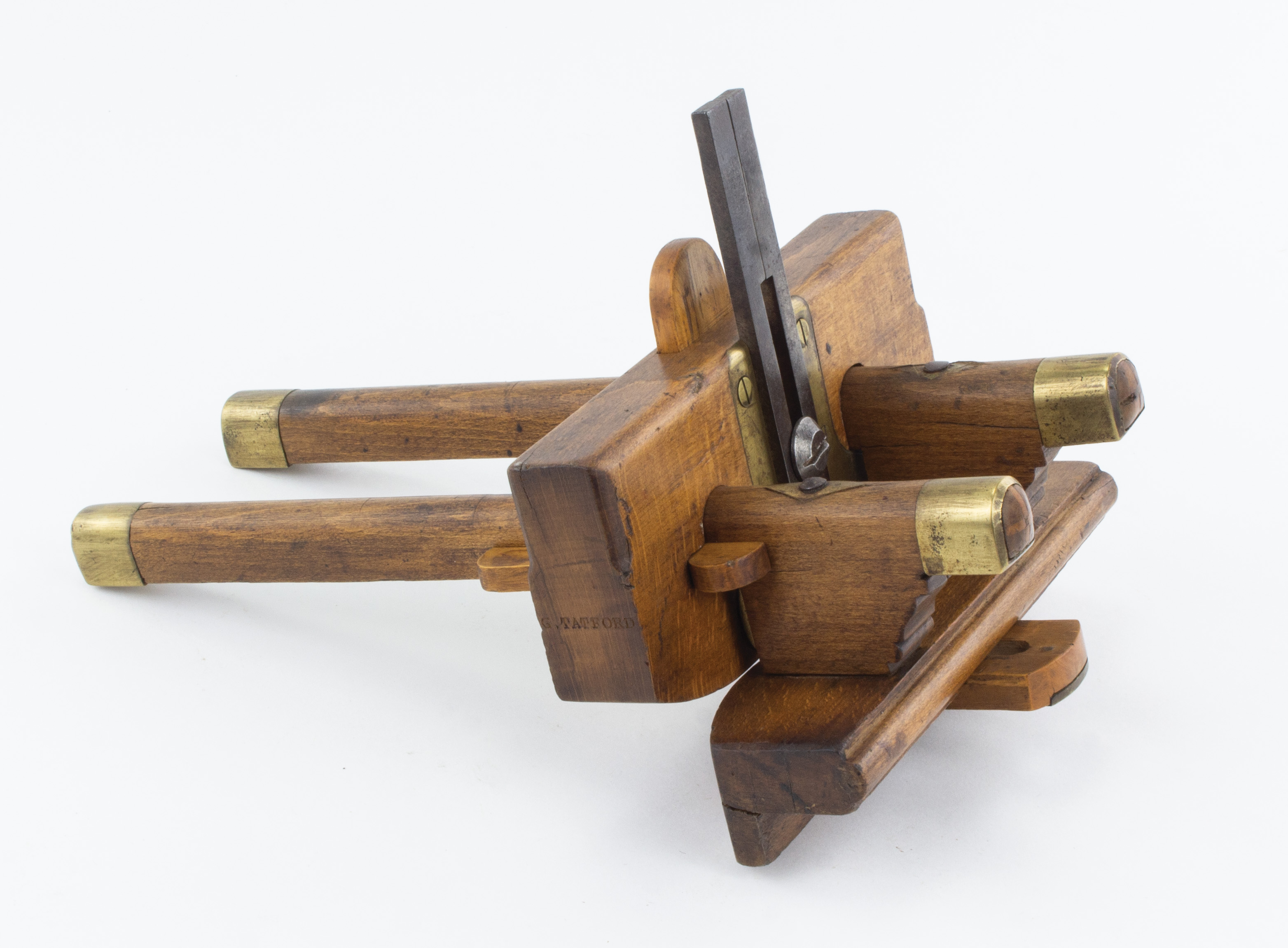 B68-288 COACHMAKER'S SLIDE-ARM ROUTER. Marked only with user name. 6-1/2" sole with adjustable curved fence. Unusual double cutter, held by screw, with both ends curving inward to form a semicircle. Boxwood depth stop and original boxwood wedges, brass caps on arms. Wood has light wear, tight crack in one shoulder and end of one arm. Very unusual design, well made. From the collection of Jim and Becky Leamy. Good + 125-250