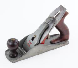 B68-292 MOVING FILLETSTER PLANE. Solid Rosewood. 9-1/2" sole, brass depth stop, wedged nicker. Marked only with user name, may be overstamped on top of maker's mark and makes it illegible. Wood has light wear. 2" skewed cutter. Nicely made. From the collection of Jim and Becky Leamy. Good + 100-200