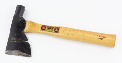 B68-296 HATCHET. Collins Tools. 3-1/4" blade, octagonal poll, and nail pulling wedge. Legitimus trademark cast into head. Original handle with intact decal. Blade has light wear but sharp, wood fine. From the collection of David Jeffers. Good+ 50-100