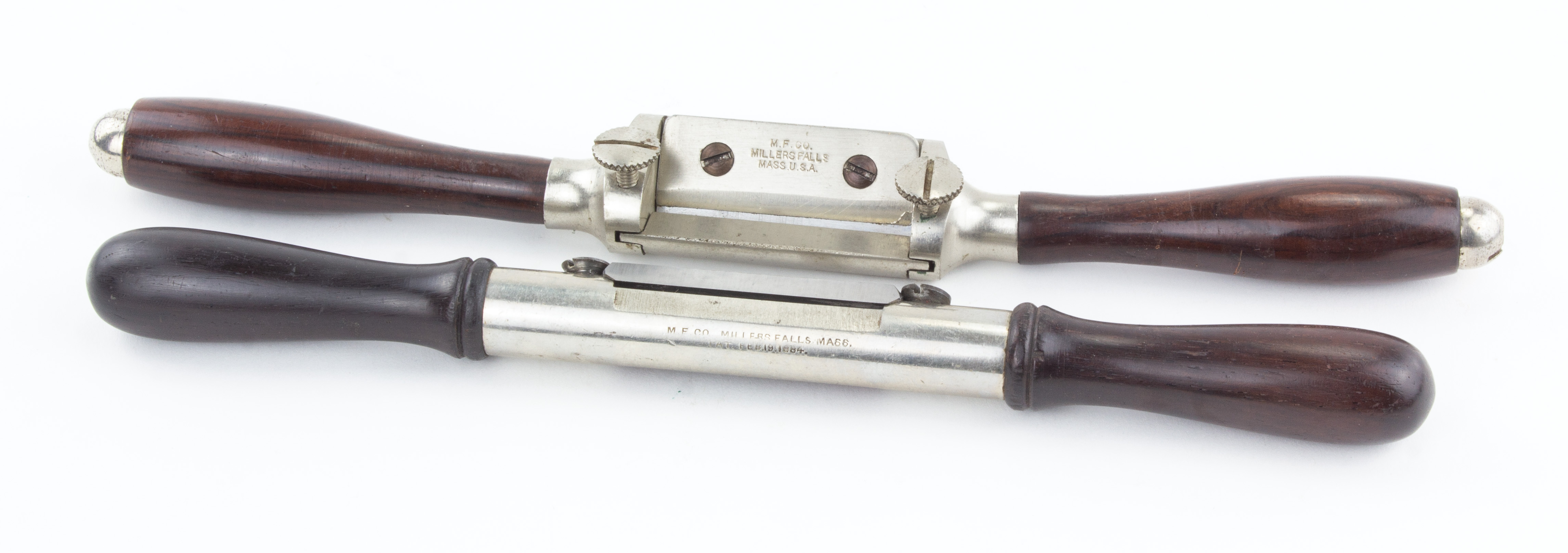 B68-297 LOT OF TWO CIRCULAR SPOKESHAVES. Millers Falls Nos. 1 and 2. The iconic No. 1 cigar shave, patented by Albert Goodell, and the far less common No. 2, based on Lanfair's patent, with its removable sole plate that could be repositioned to change the profile. Both with rosewood handles, clean and sharp. 50% red japanning in throat on the No. 1. From the collection of Bill Webber. Good+ 60-120