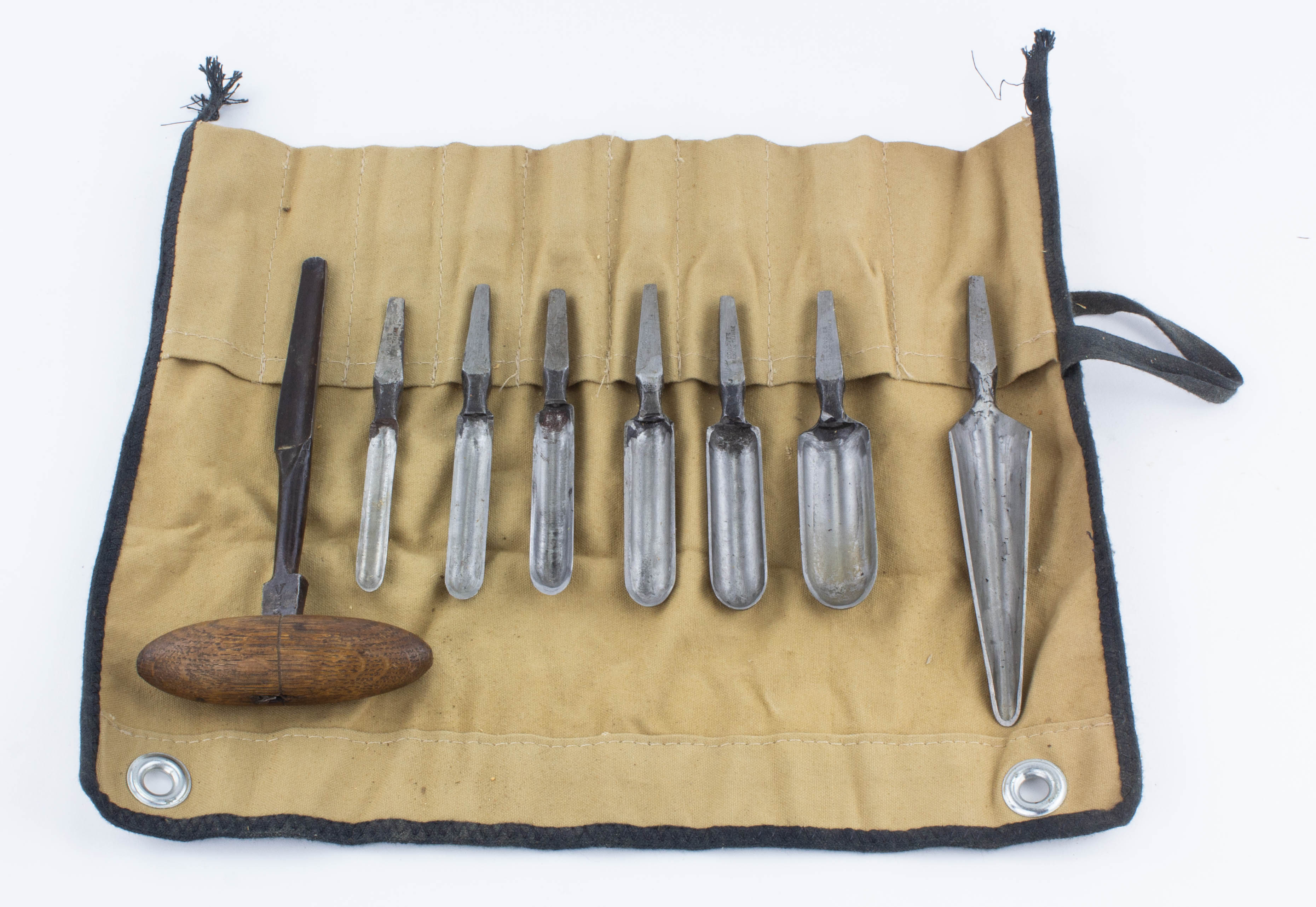 B68-299 SET OF SPOON AUGER BITS. Conover. Seven bits made by Eric Conover, a respected authority on traditional chairmaking, marked "Conover Made in Taiwan," plus one additional bit by a different maker with wooden handle. In original cloth roll. Good 100-200